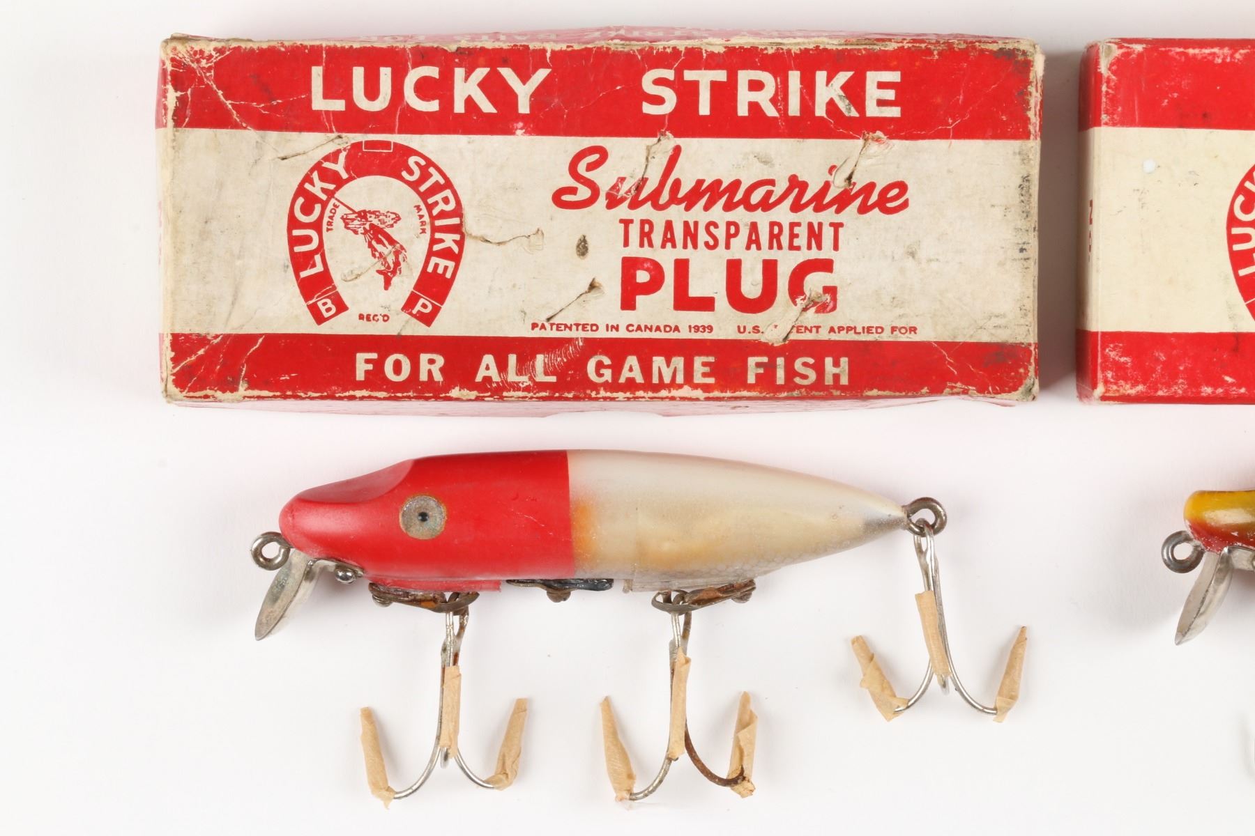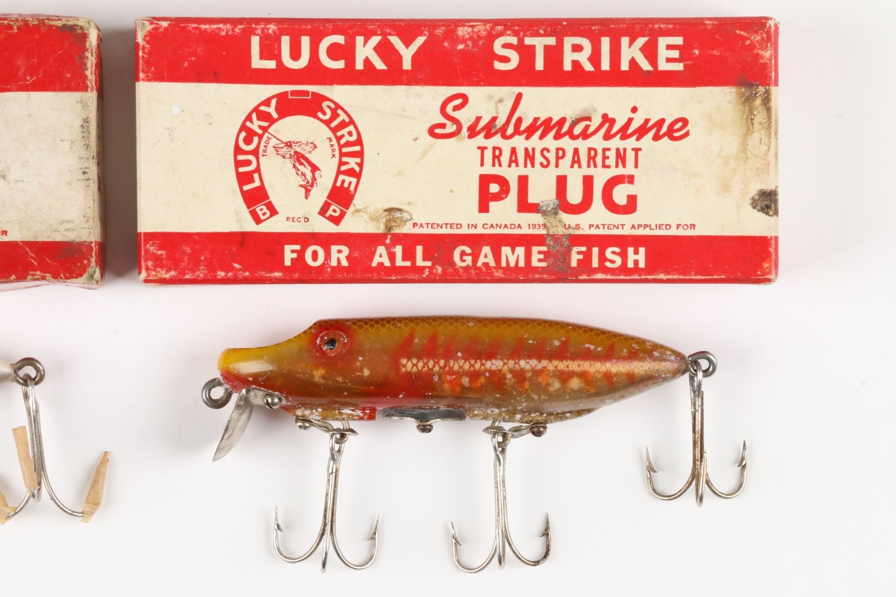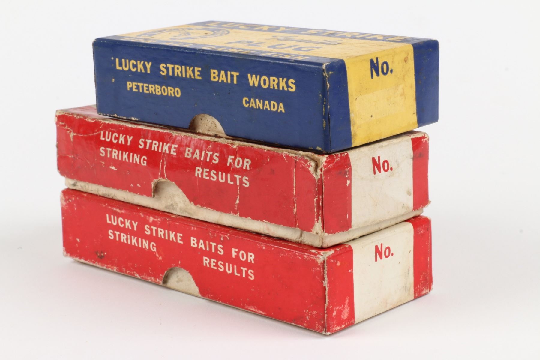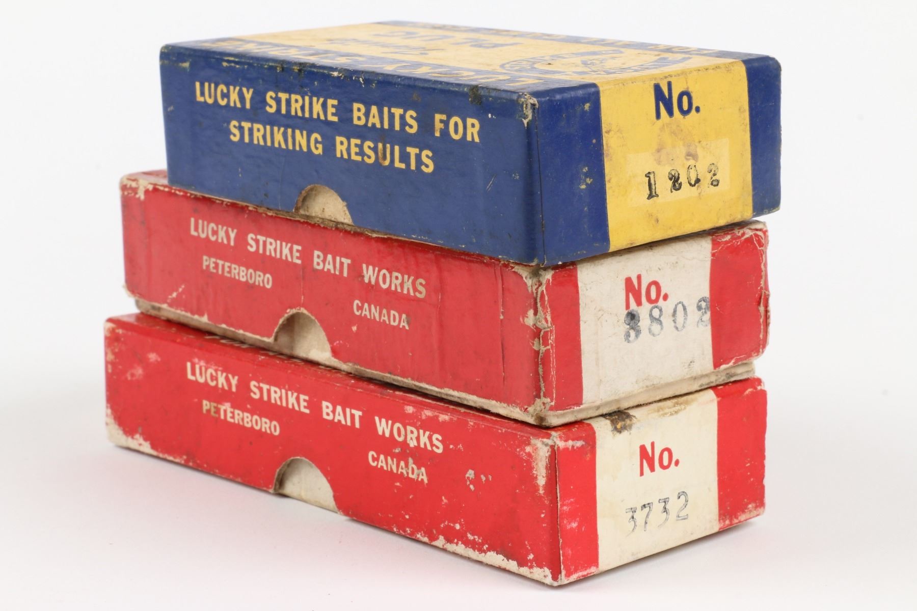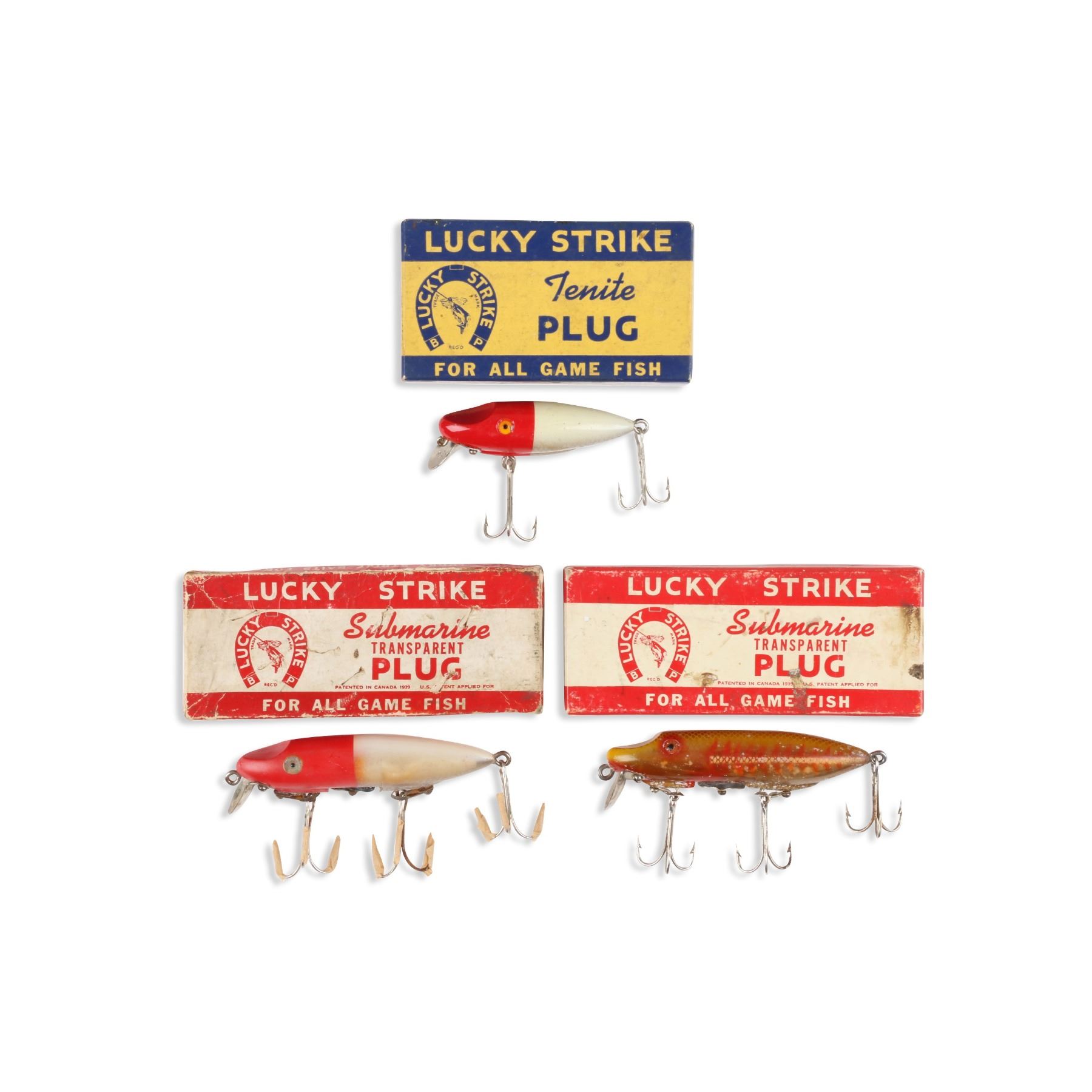 Lucky Strike Bait Works, Canada. 1950s. R/W x 2 and Yellow with Red Shore. Material: Tenite, Plastic. Quantity: 3. Grade: G. 4.25" - 5.25" boxes. Est. $100-125.