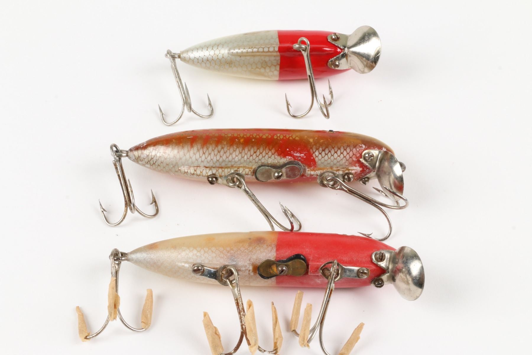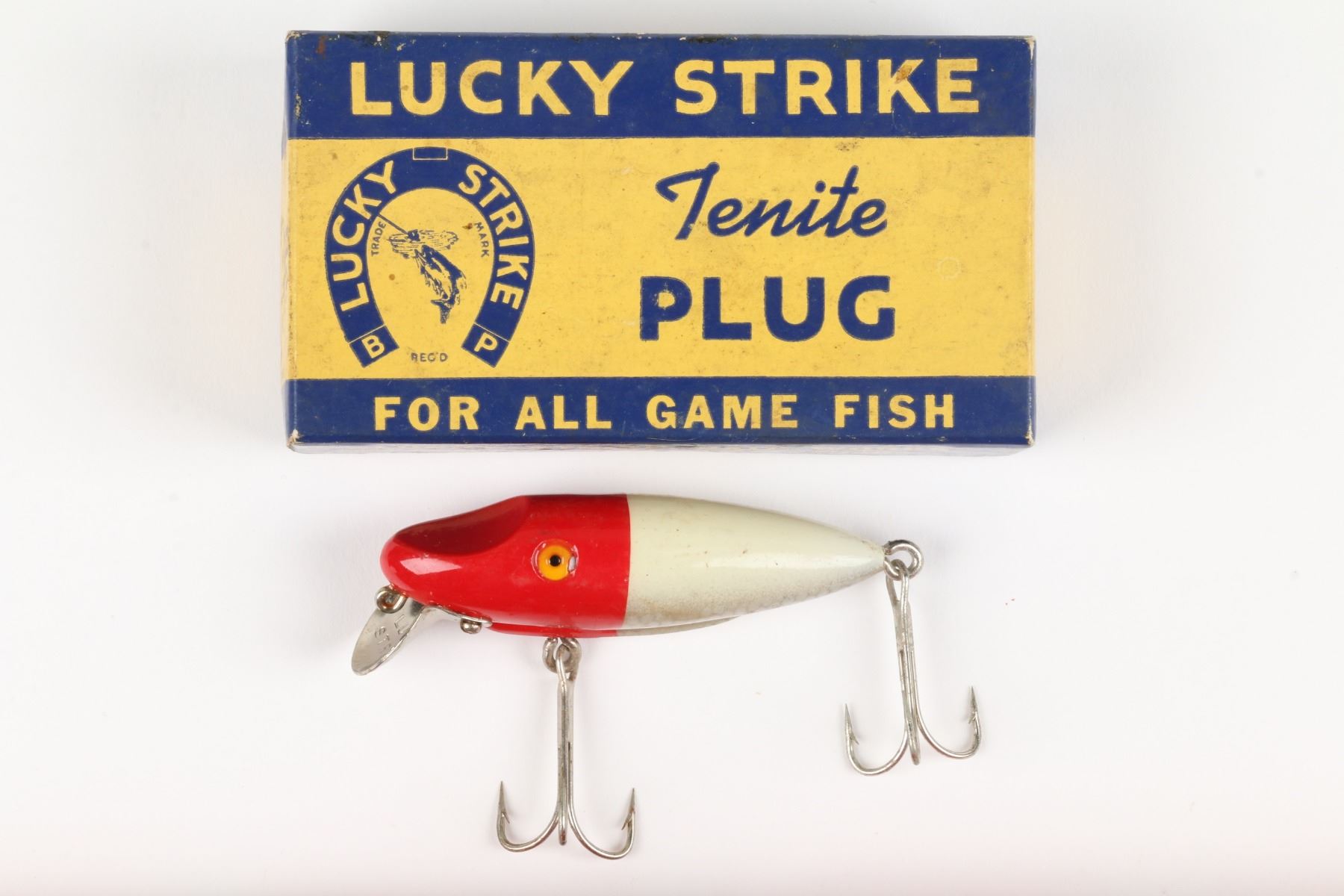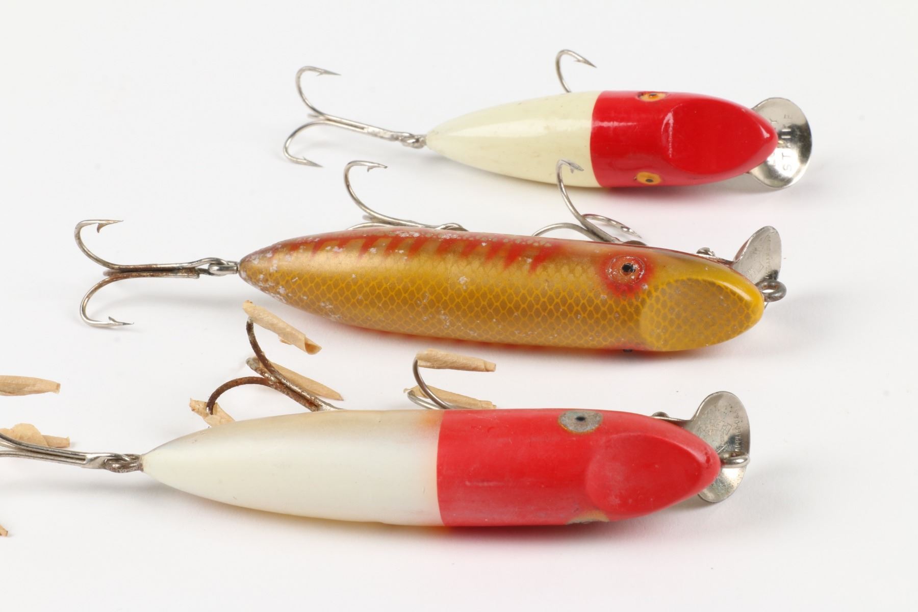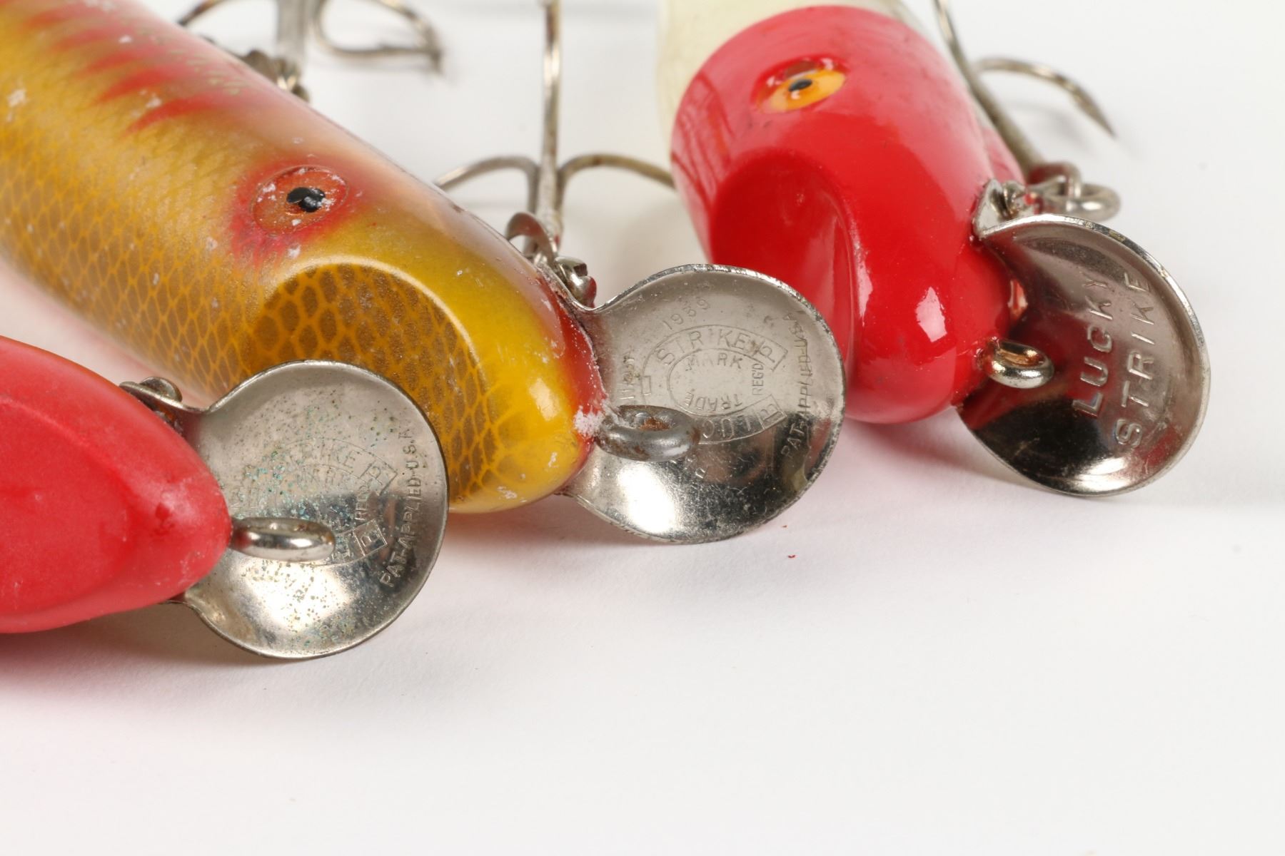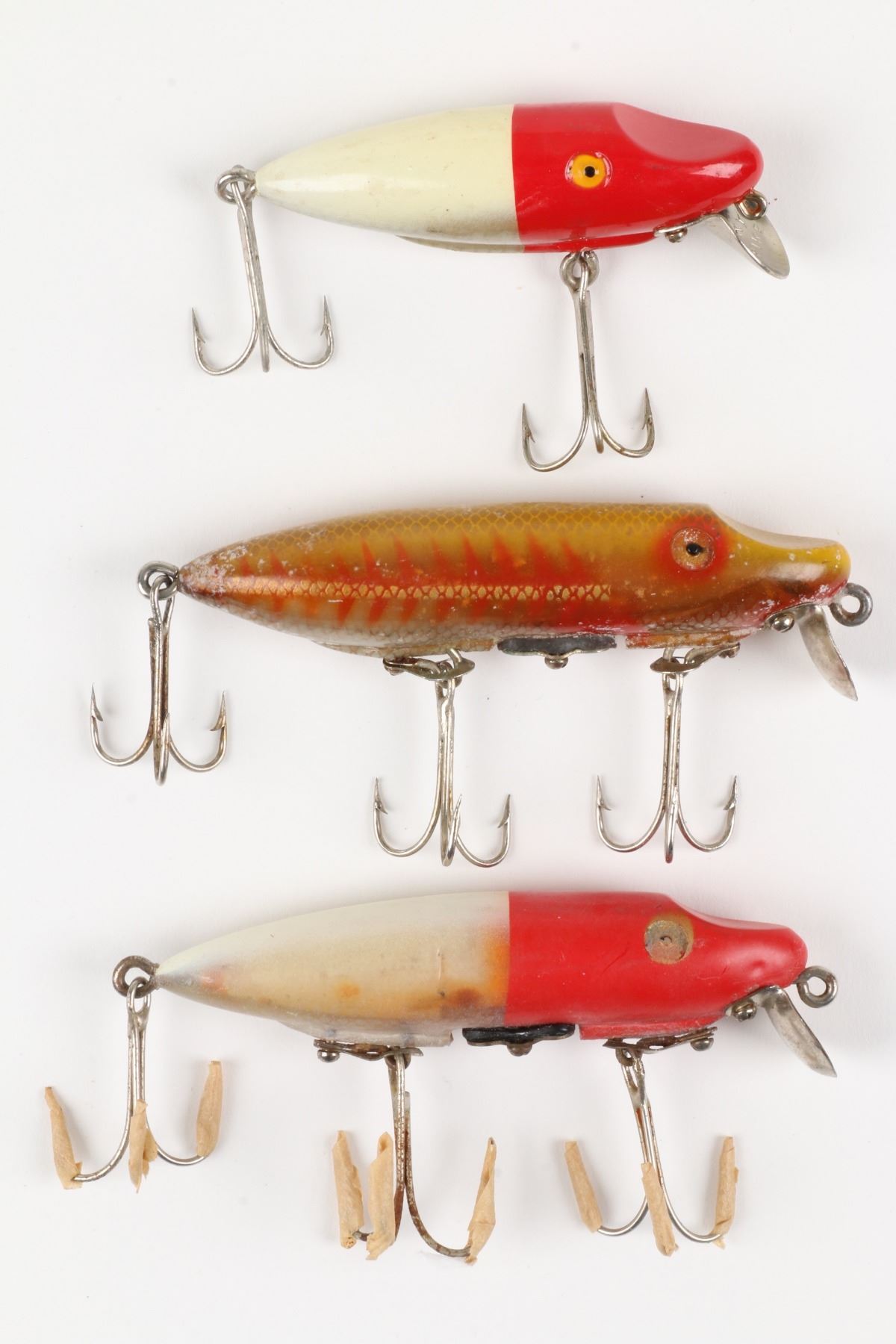 Lucky Strike Bait Works, Canada. 1950s. R/W x 2 and Yellow with Red Shore. Material: Tenite, Plastic. Quantity: 3. Grade: G. 4.25" - 5.25" boxes. Est. $100-125.