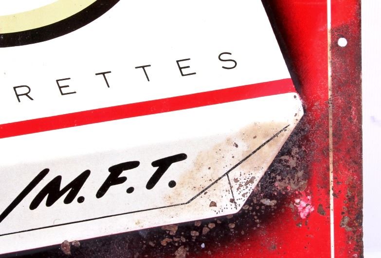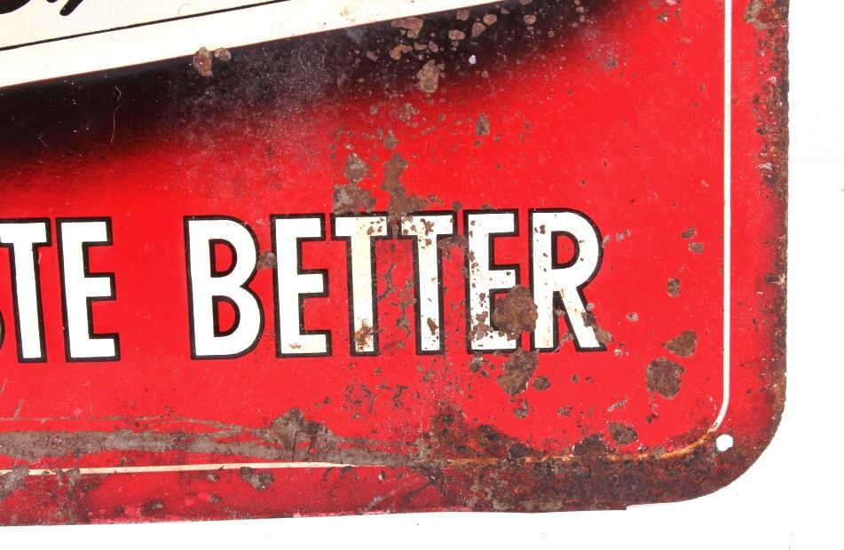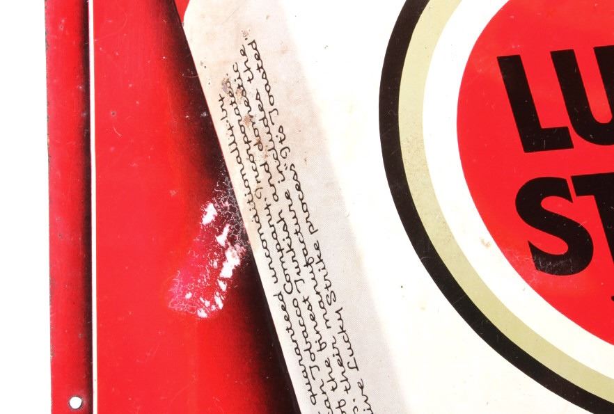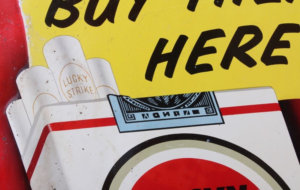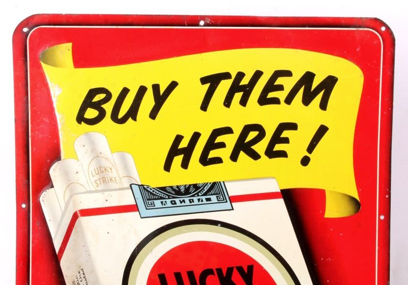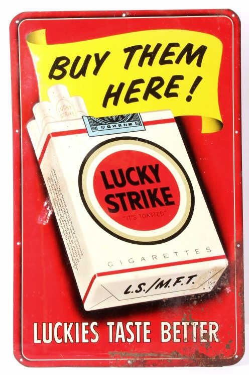 This is an original Lucky Strike tin advertising sign. The sign shows a pack of cigarettes with a banner that reads "Buy Them Here!". The sign is in good overall condition. There is some wear and rust as shown. The sign measures 12.5" x 19.25".
