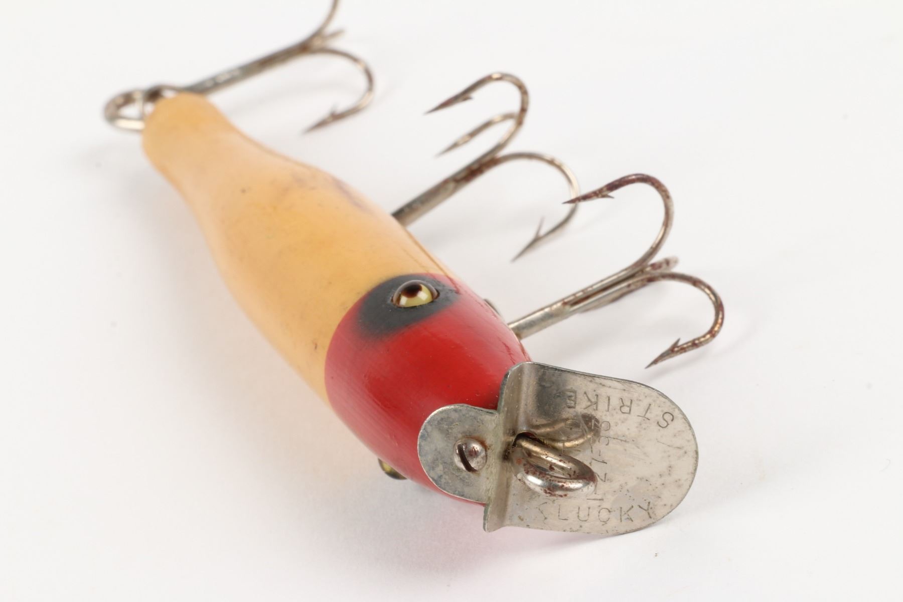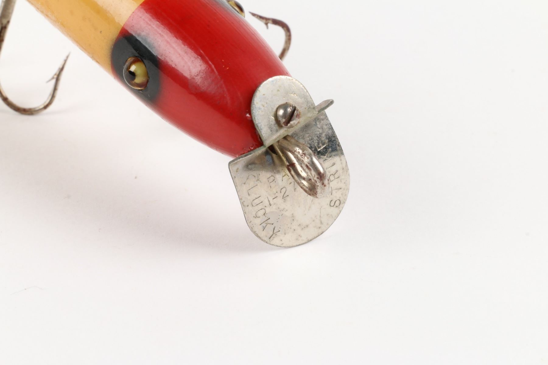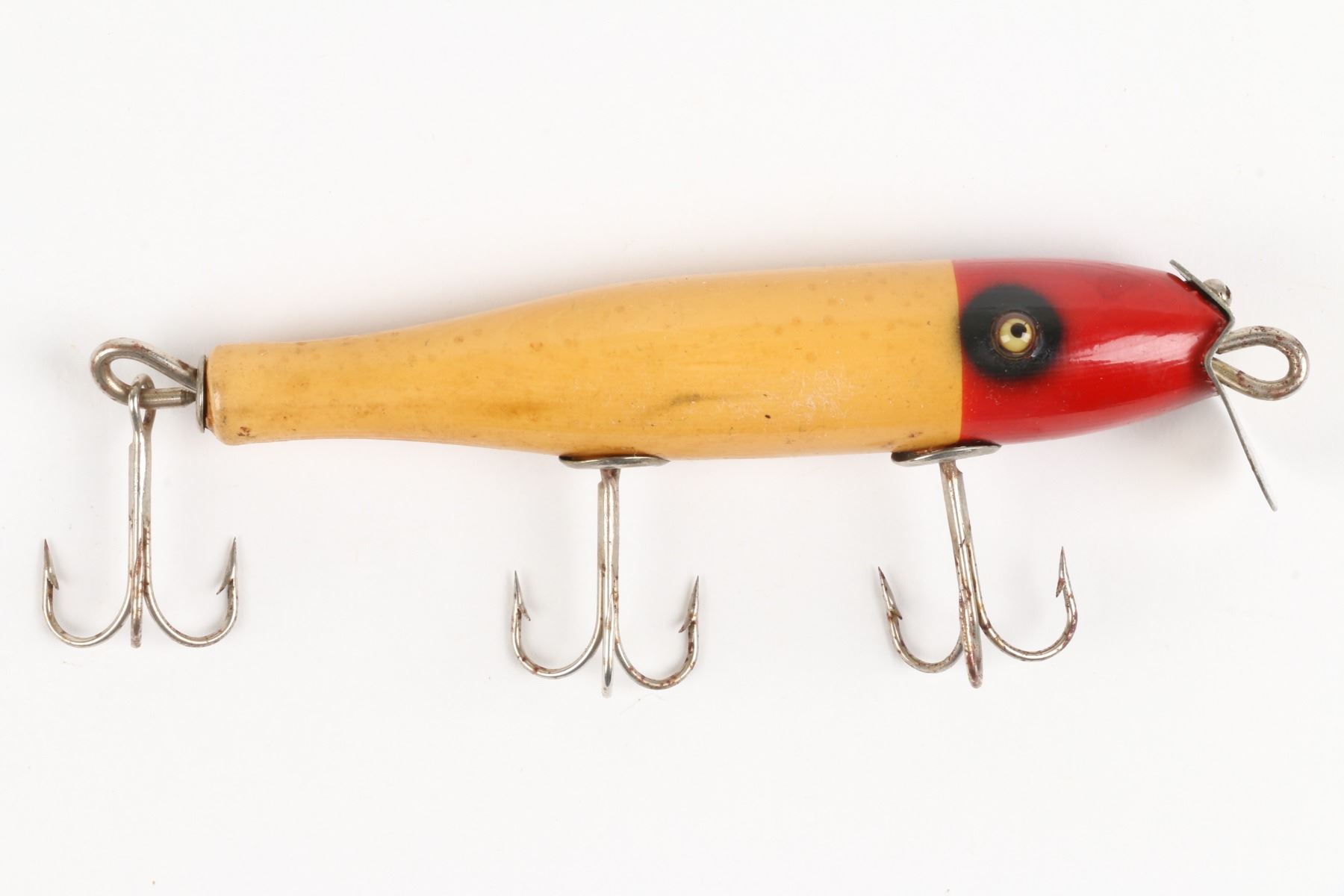 Lucky Strike Bait Works, Canada. 1930s. Red and White. Material: Wood. Quantity: 1. Grade: VG. 4.5" Est. $100-125.