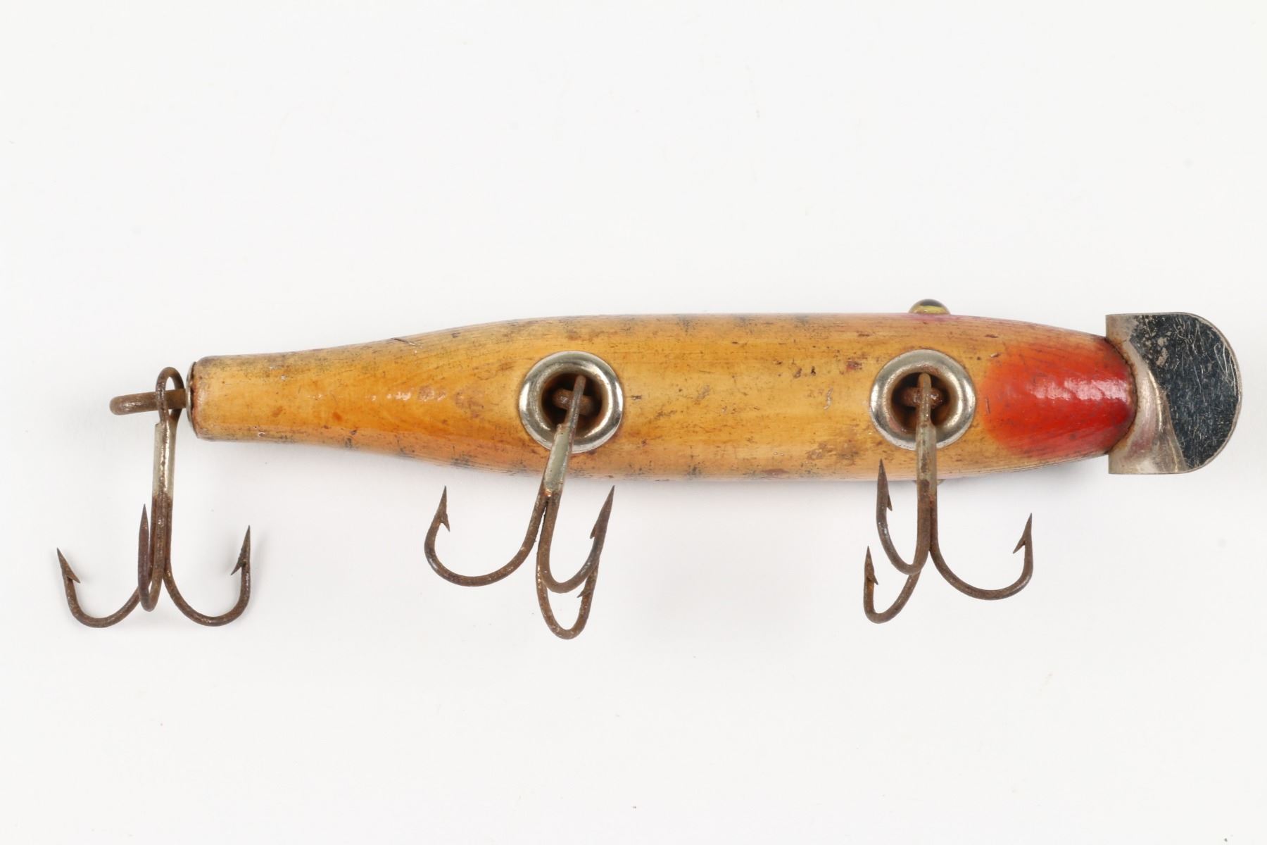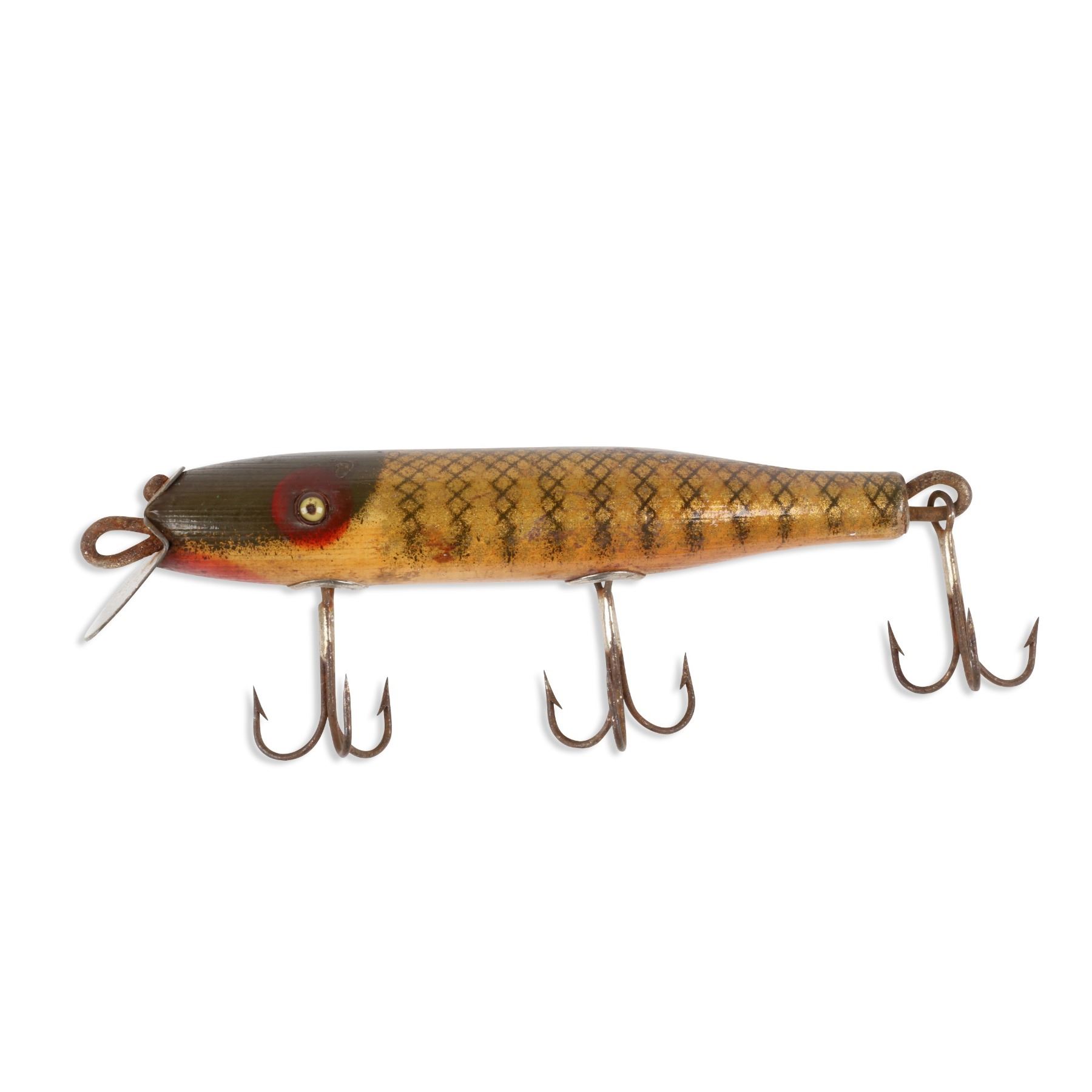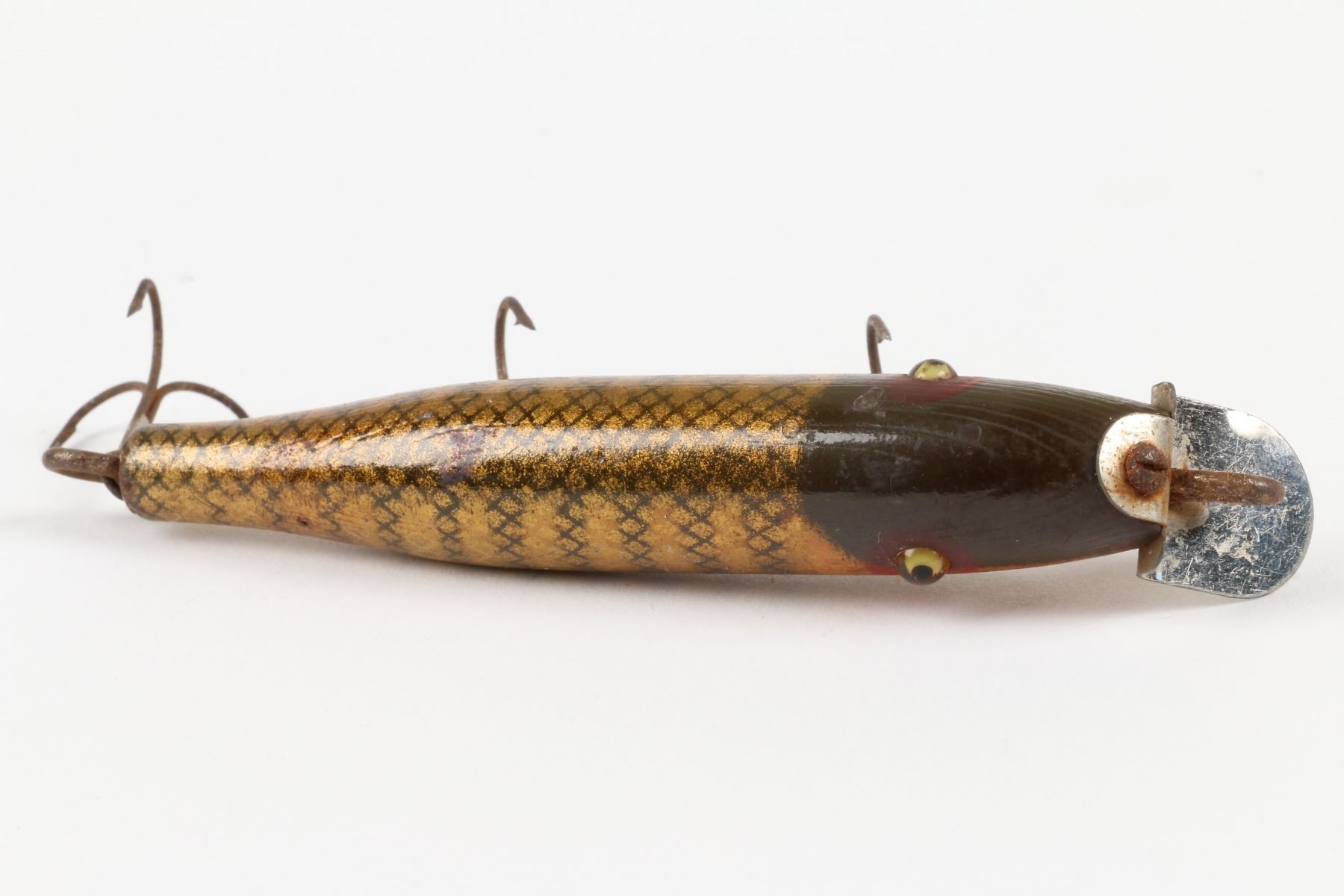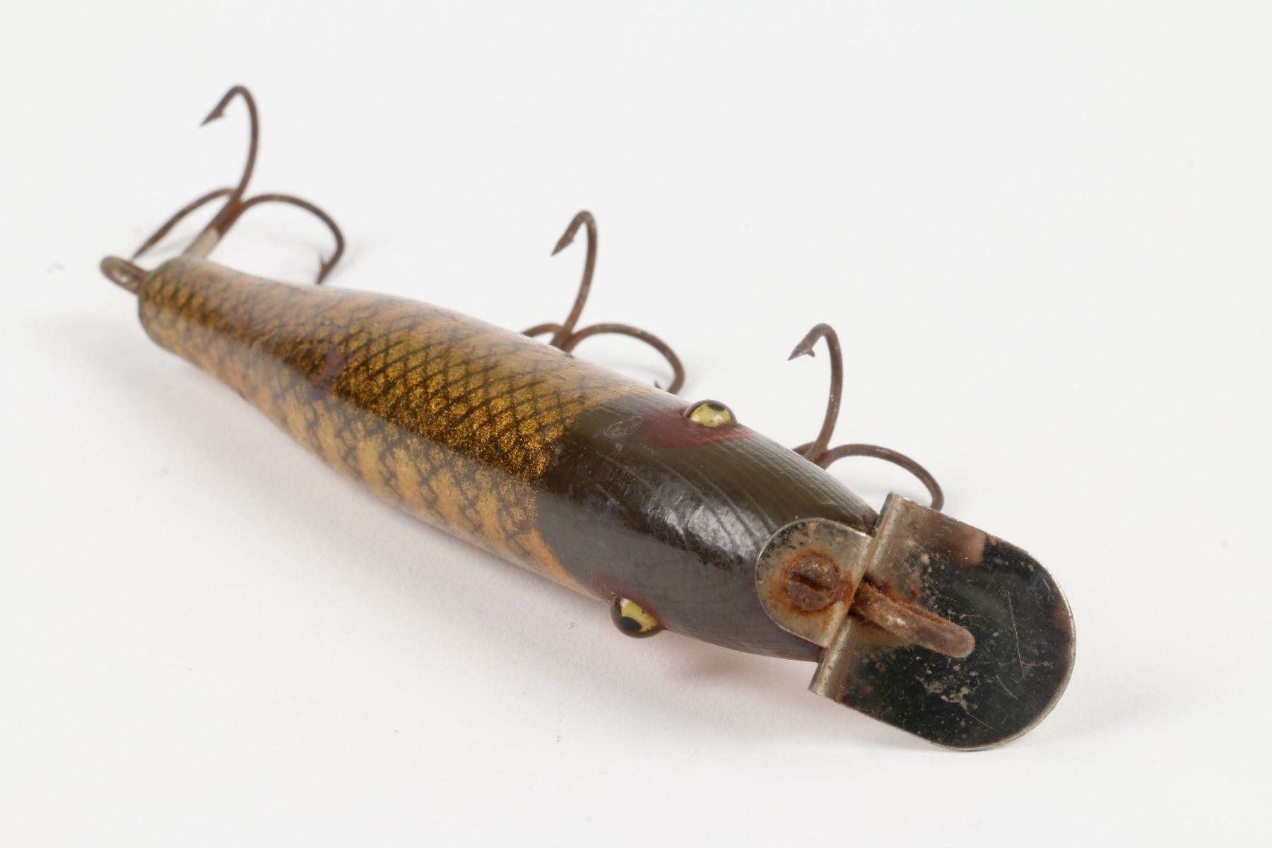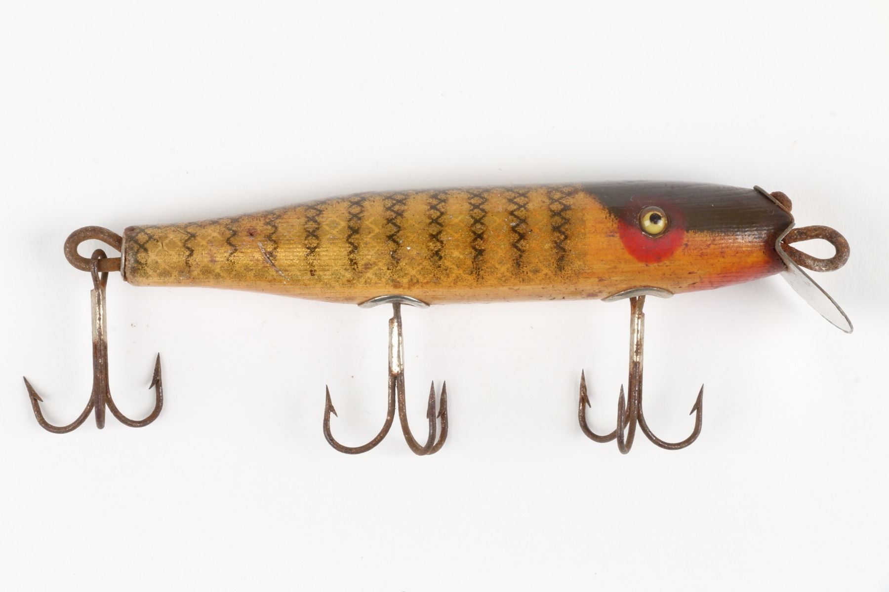 Lucky Strike Bait Works, Canada. 1930s. Early Cross Hatch Pike Scale. Material: Wood. Quantity: 1. Grade: VG. 4" Est. $125-150.