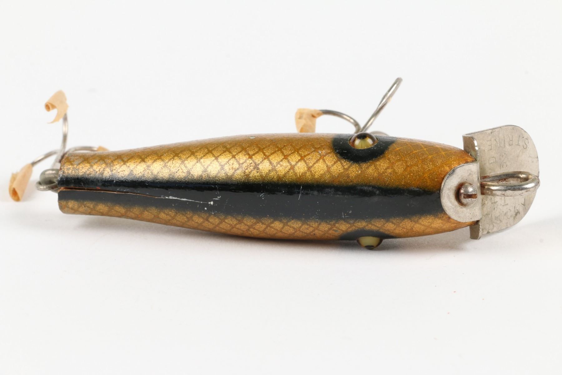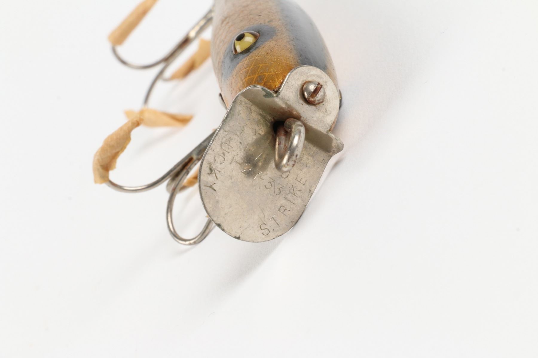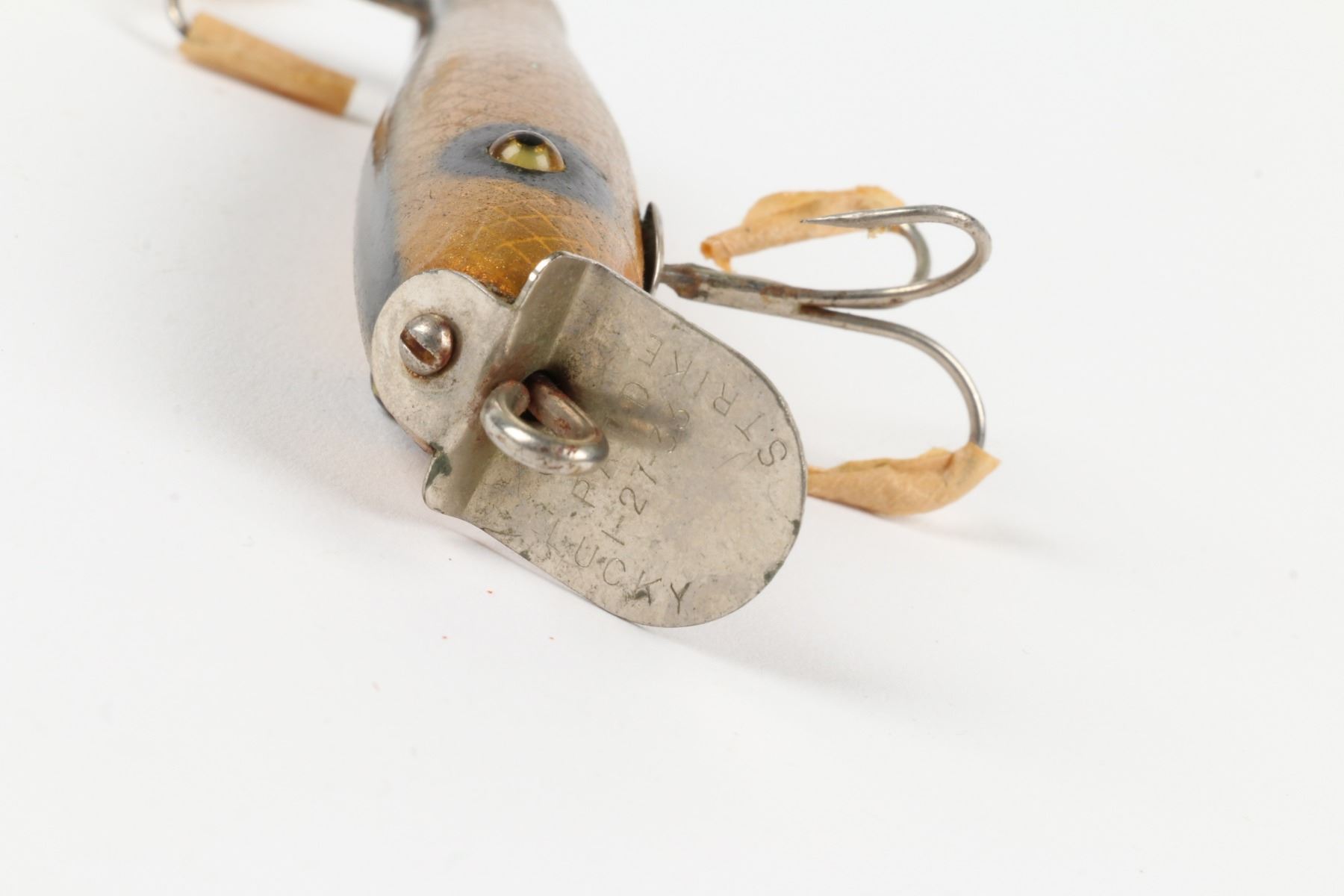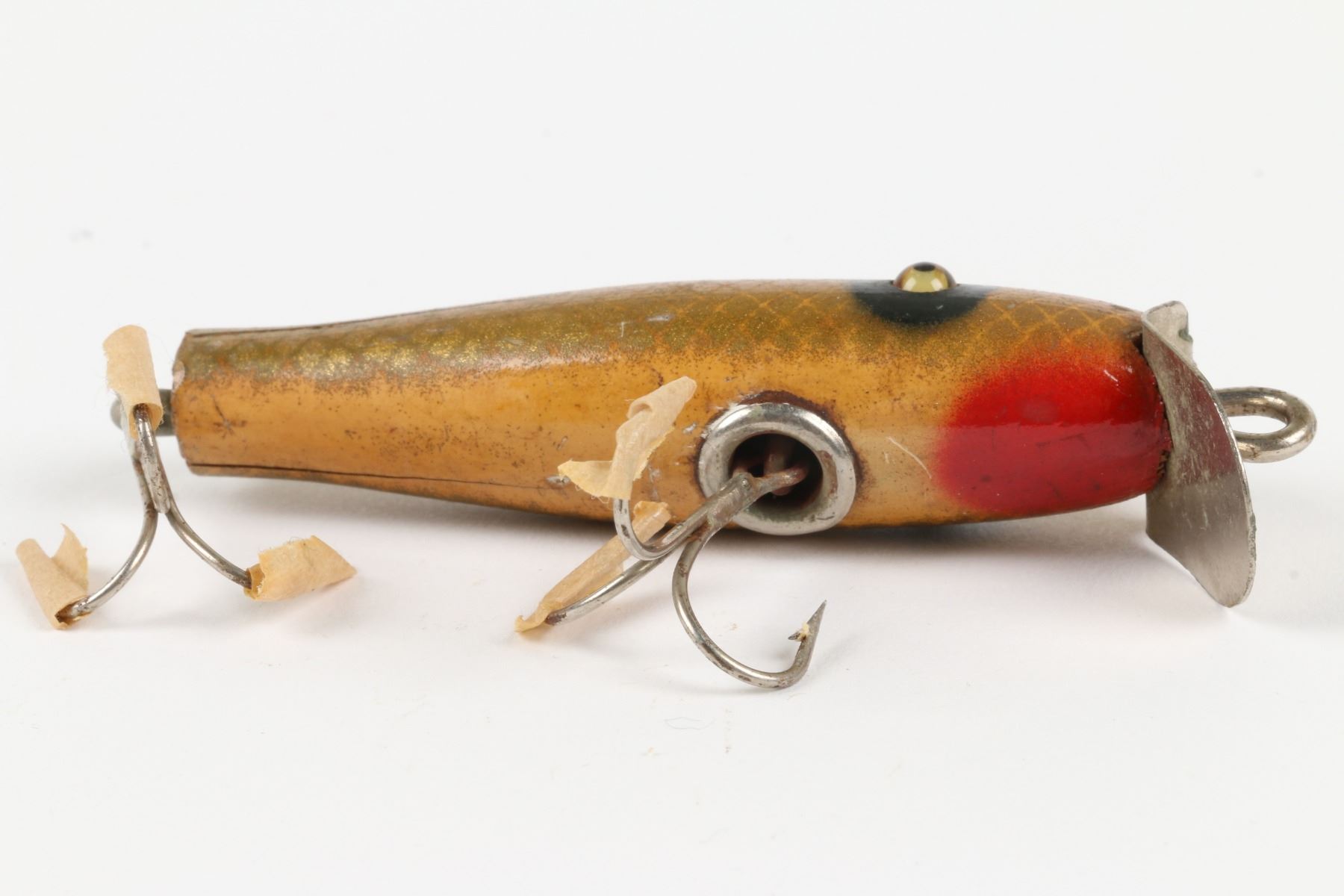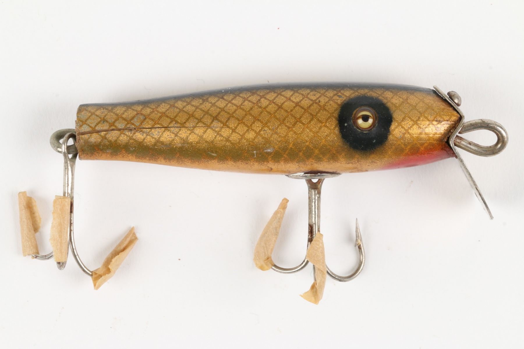 Lucky Strike Bait Works, Canada. 1930s. Early Cross Hatch Gold Scale. Material: Wood. Quantity: 1. Possibly cut down. Grade: G-. 3" Est. $50-75.