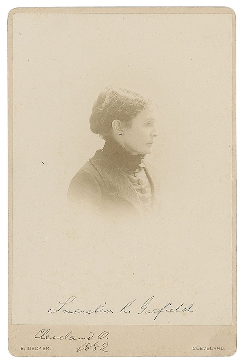 Lovely 4.25 x 6.5 cabinet photo of Garfield in profile by E. Decker of Cleveland, signed in ink, "Lucretia R. Garfield, Cleveland, O., 1882." In fine condition.