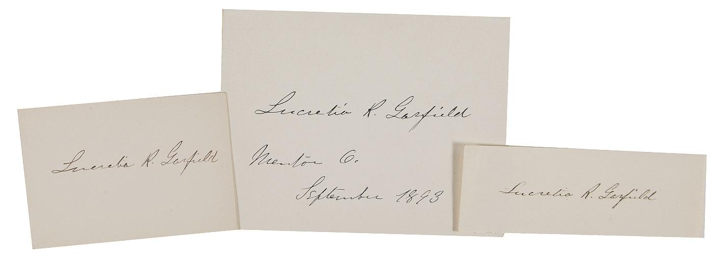 Wife (1832–1918) of President James Garfield and first lady from March to September 1881. Three ink signatures, “Lucretia R. Garfield,” on various size off-white cards and slips, one dated September 1893. In fine condition.