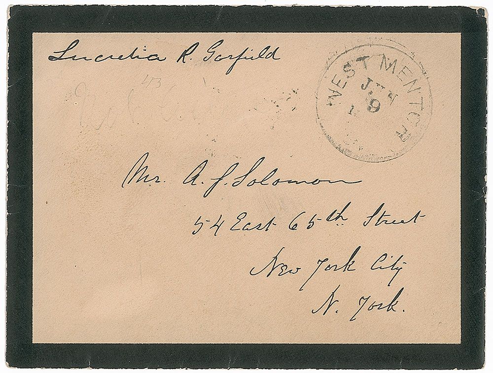 Hand-addressed and free franked black-bordered mourning envelope, 4.5 x 3.25, addressed to, “Mrs. A. J. Solomon, 54 East 65th Street, New York City, N. York,” and franked across the top, “Lucretia R. Garfield.” Envelope bears a June 9, West Mentor, postmark, and a June 10, 1890, cancellation on the detached back flap. In fine condition, with mild toning and some light pencil remnants to front.