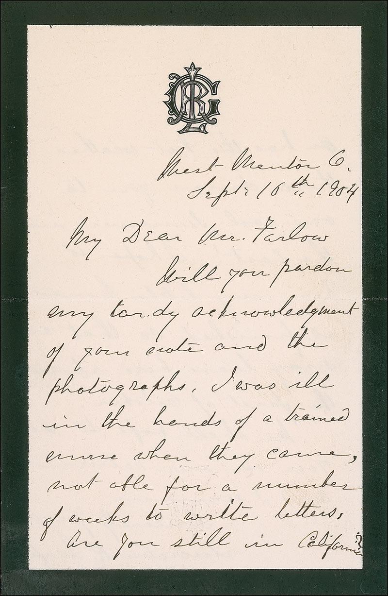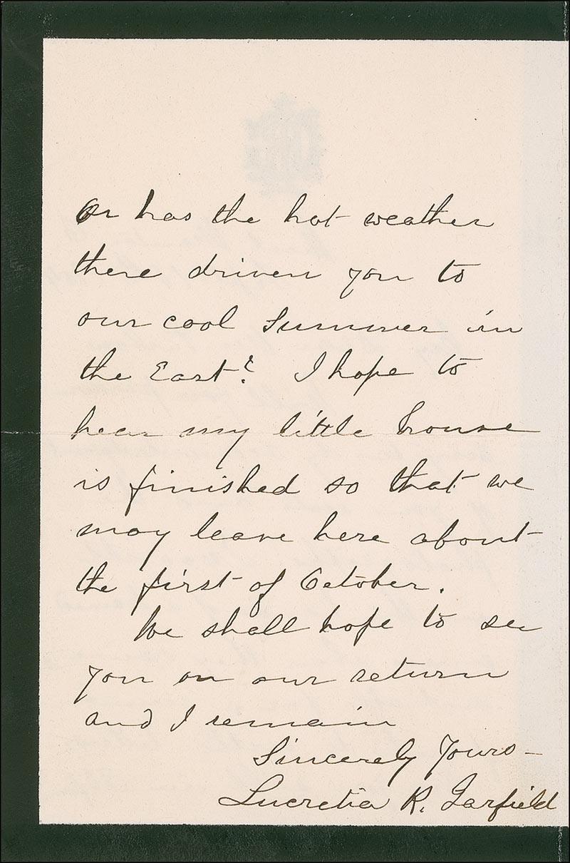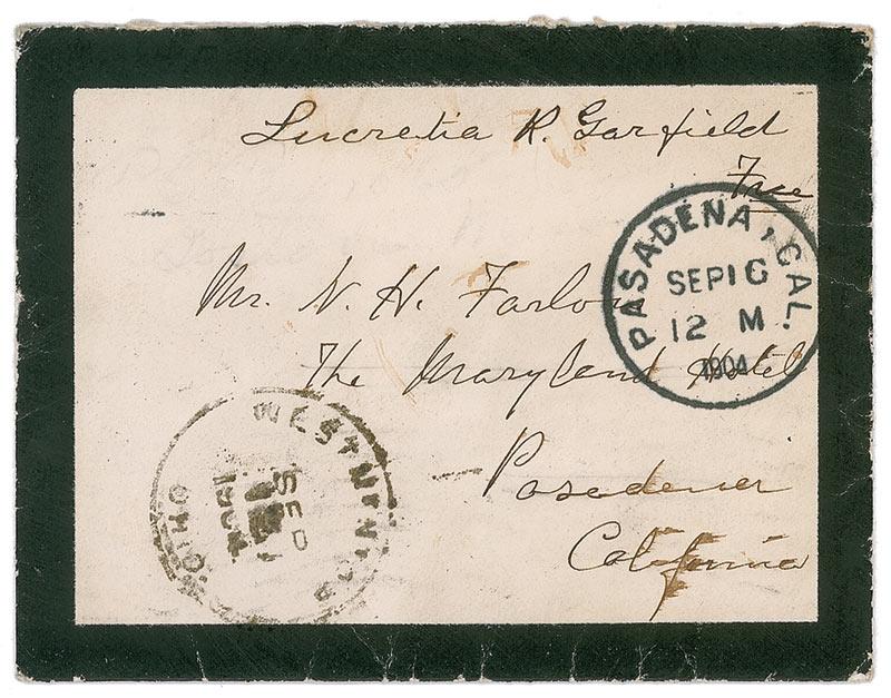 ALS signed “Lucretia R. Garfield,” one page both sides, 3.75 x 5.75, black-bordered personal letterhead letterhead, September 10, 1904. Letter to N. H. Farlow in Pasadena. In part: “Will you pardon my tardy acknowledgement of your note and the photographs. I was ill in the hands of a trained nurse…I hope to hear my little house is finished so that we may leave here about the first of October.” In fine condition. Accompanied by the original black-bordered free franked mailing envelope, addressed in Garfield’s hand, and franked along the top, “Lucretia R. Garfield, Free.”