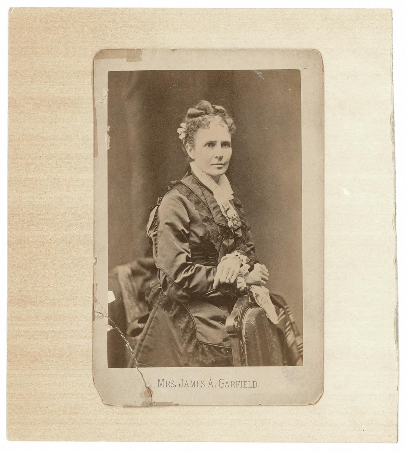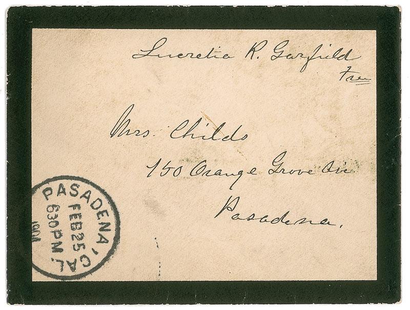 Wife (1832–1918) of President James Garfield and first lady from March to September 1881. Hand-addressed and free franked black-bordered mailing envelope, 4 x 3, addressed by Garfield to “Mrs. Childs, 750 Orange Grove Cir., Pasadena” and franked along the top, “Lucretia R. Garfield, Free.” Envelope is postmarked February 25, 1904. Scattered soiling touching portions of her name, otherwise fine condition. Accompanied by an unsigned cabinet photo affixed to larger piece of light cardboard.