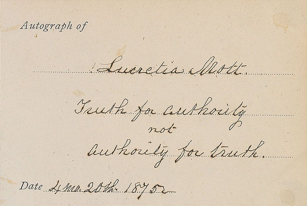AQS on a 3.75 x 2.5 off-white slip affixed to a slightly larger gray sheet. In full: “Lucretia Mott. Truth for authority not authority for truth. 4 mo. 20th. 1875.” In fine condition, with a bit of scattered light toning from adhesive on reverse.
