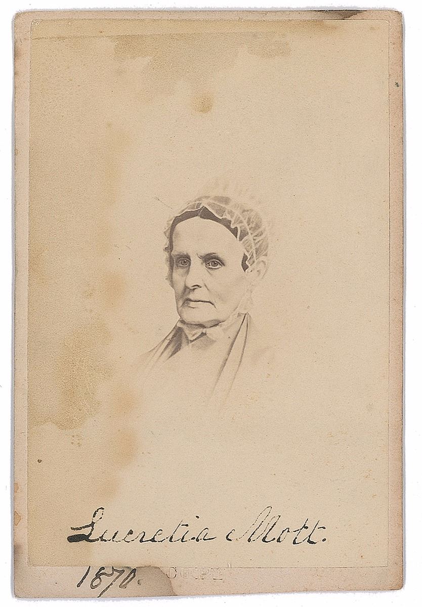 Reformer (1793–1880) active in the Underground Railroad and the first president of the American Equal Rights Association. Uncommon 2.5 x 3.75 carte-de-visite bust portrait of the famed reformer, signed in black ink, “Lucretia Mott,” and dated below, “1870.” Published by Henszey and Co. of Philadelphia. Dampstaining to left side, affecting the date and first letter of the signature, otherwise fine condition.