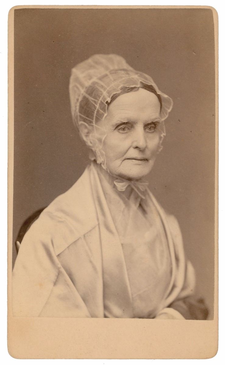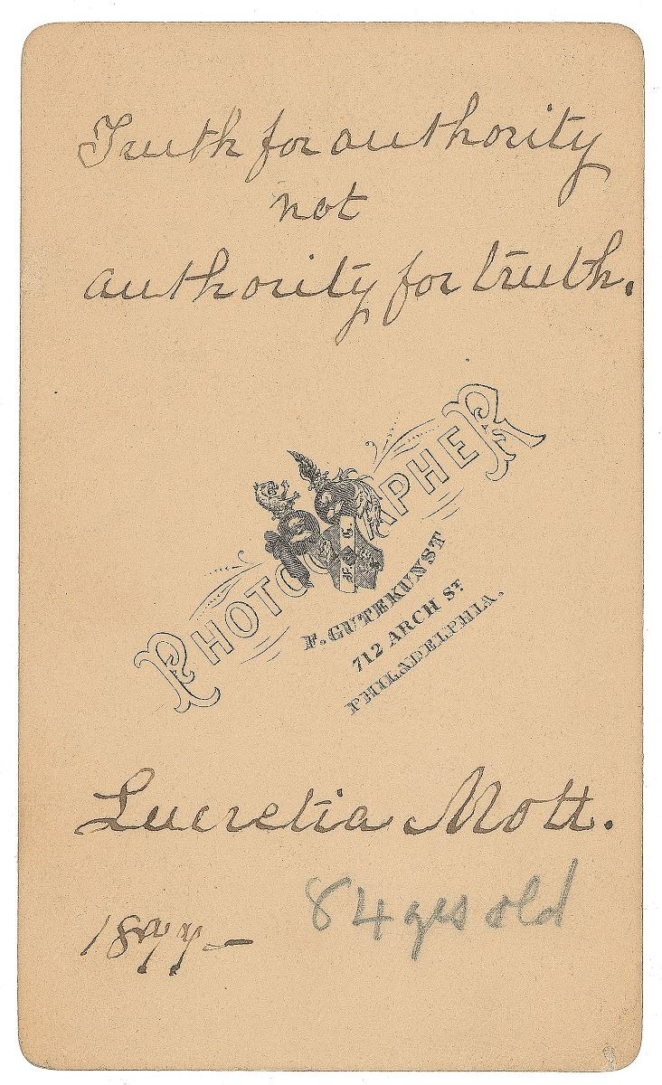 Reformer (1793–1880) active in the Underground Railroad and the first president of the American Equal Rights Association. Appealing 2.5 x 4 carte-de-visite bust portrait of the famed reformer, signed on the reverse in black ink by Mott, who adds a brief quote, “Truth for authority, not authority for truth, Lucretia Mott, 1877.” In fine condition.