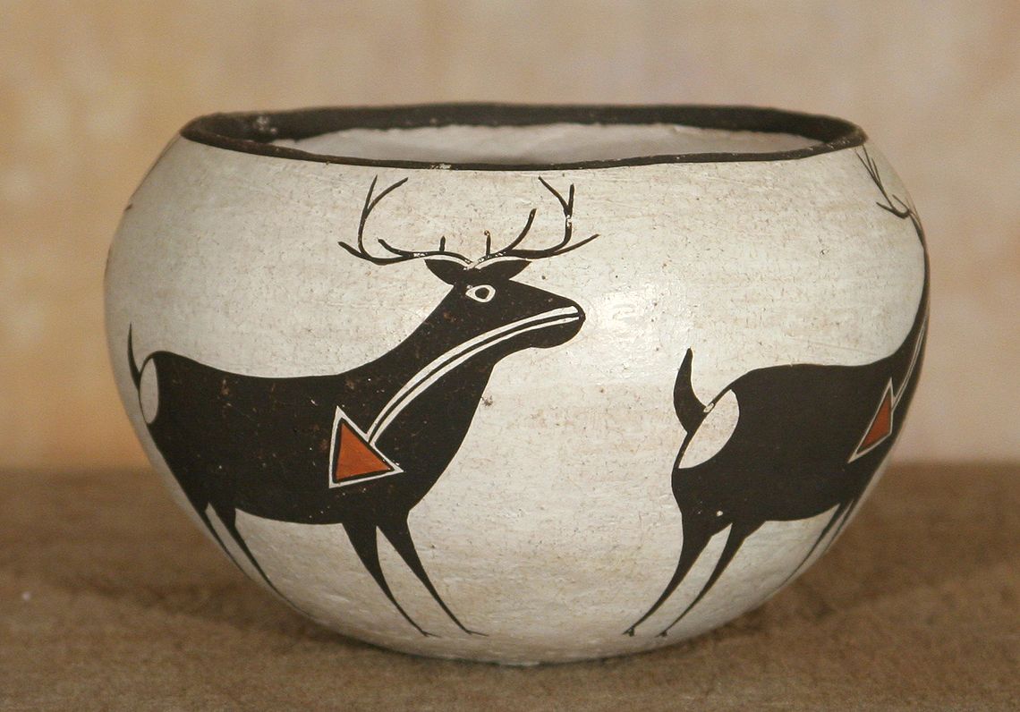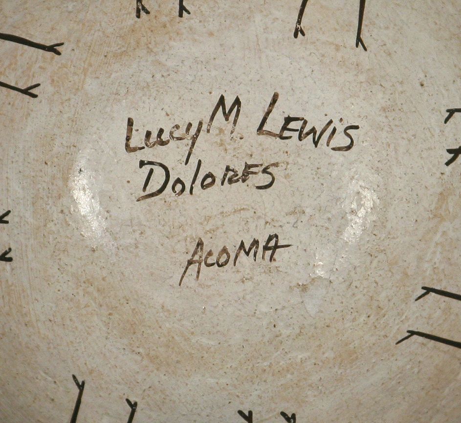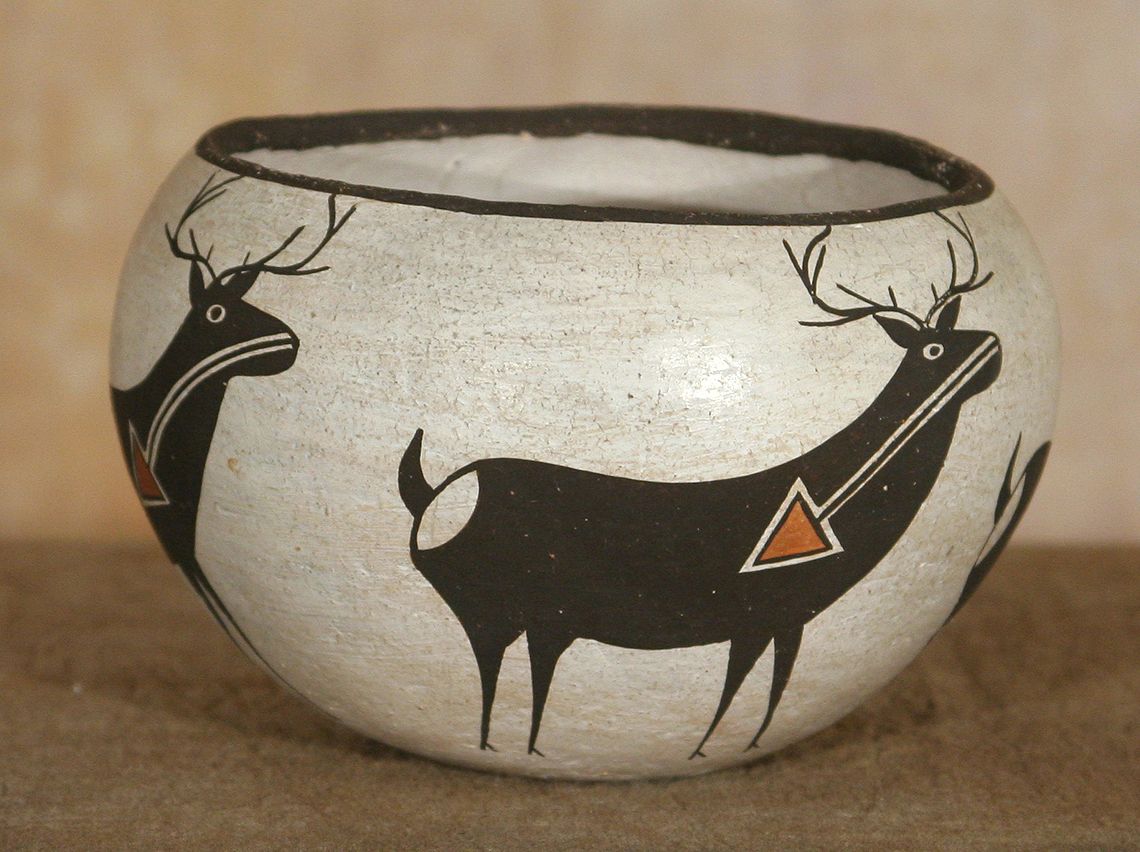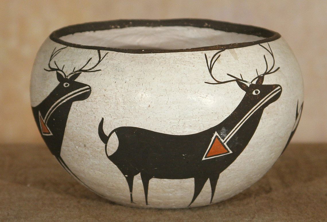 Acoma Deer Heartline Style Pot. 3 ½" x 5 ½" by Lucy M. Lewis (1898-1992). Signed on the base. (est. $1,500-2,500). CONDITION REPORTS: www.auctioninsantafe.com/docs/cr2012.pdf