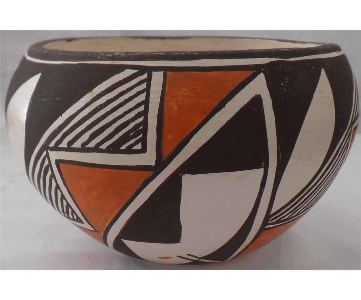 This is a good old Lucy Lewis Bowl which measures 4x5 inches and has a 4 inch opening. This Acoma pot is from New Mexico and is signed. There are minor scuffs and scratches. Shipping $25.00 Must be double boxed. Harvey Collection.