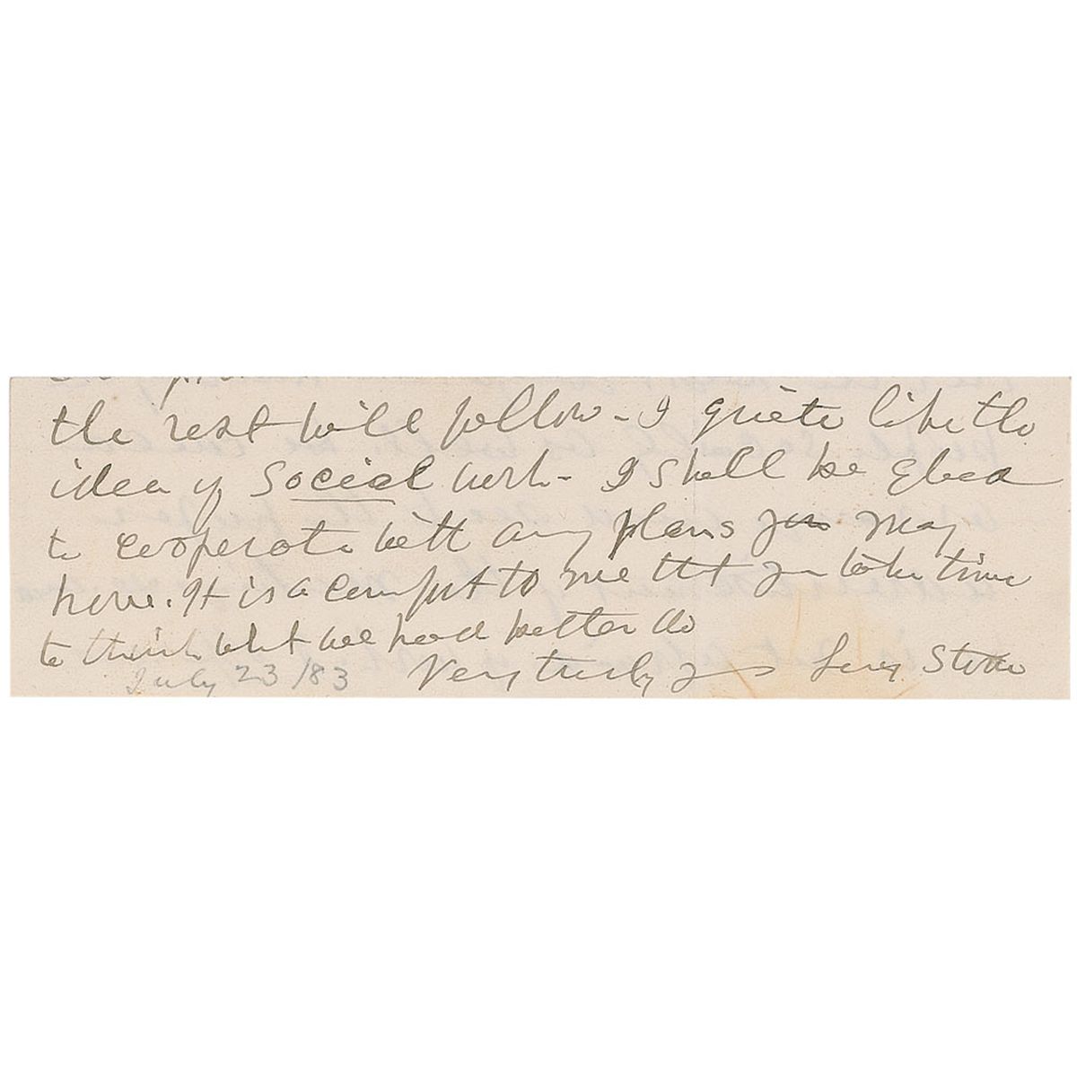 Suffragist; organized the first national woman’s rights convention and aided in forming the American Woman Suffrage Association. Partial ALS, on a clipped 5 x 1.5 portion of a longer letter. Stone writes, in part: “I quite like the idea of Social work—I shall be…to cooperate with any plans…It is a comfort to me…to think what we had better do.” In very good condition, with a vertical crease and some light surface creasing, and a pencil notation in another hand, dating the letter July 23, 1883.