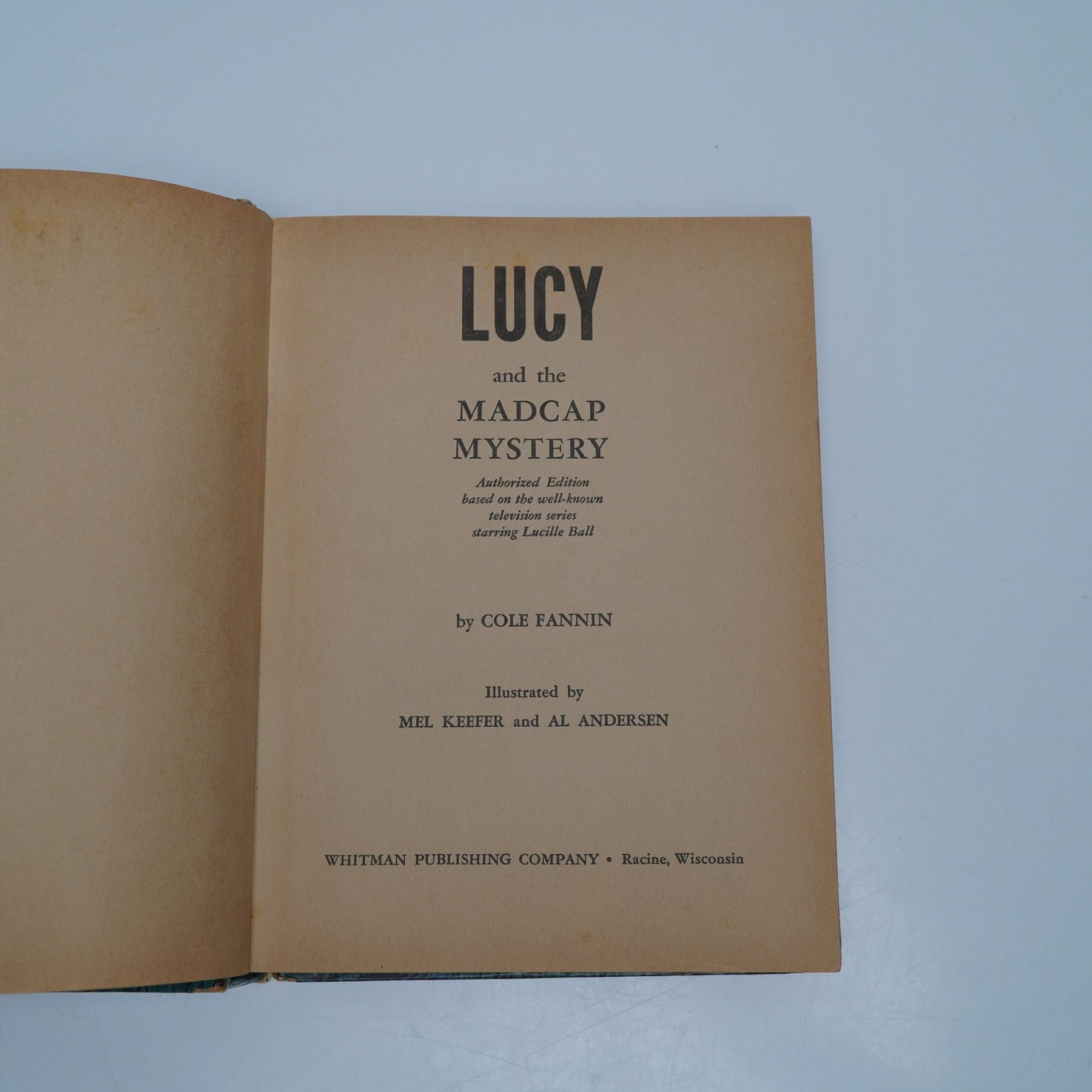 Vintage hardcover book Lucy and the Madcap Mystery, written by Cole Fannin and illustrated by Mel Keefer and Al Andersen. Published in 1965 by Whitman Publishing Company, this book is an authorized edition based on the television series starring Lucille Ball. The story follows Lucy Carmichael on an adventurous and comedic mystery. The book features a colorful illustrated cover and interior illustrations.