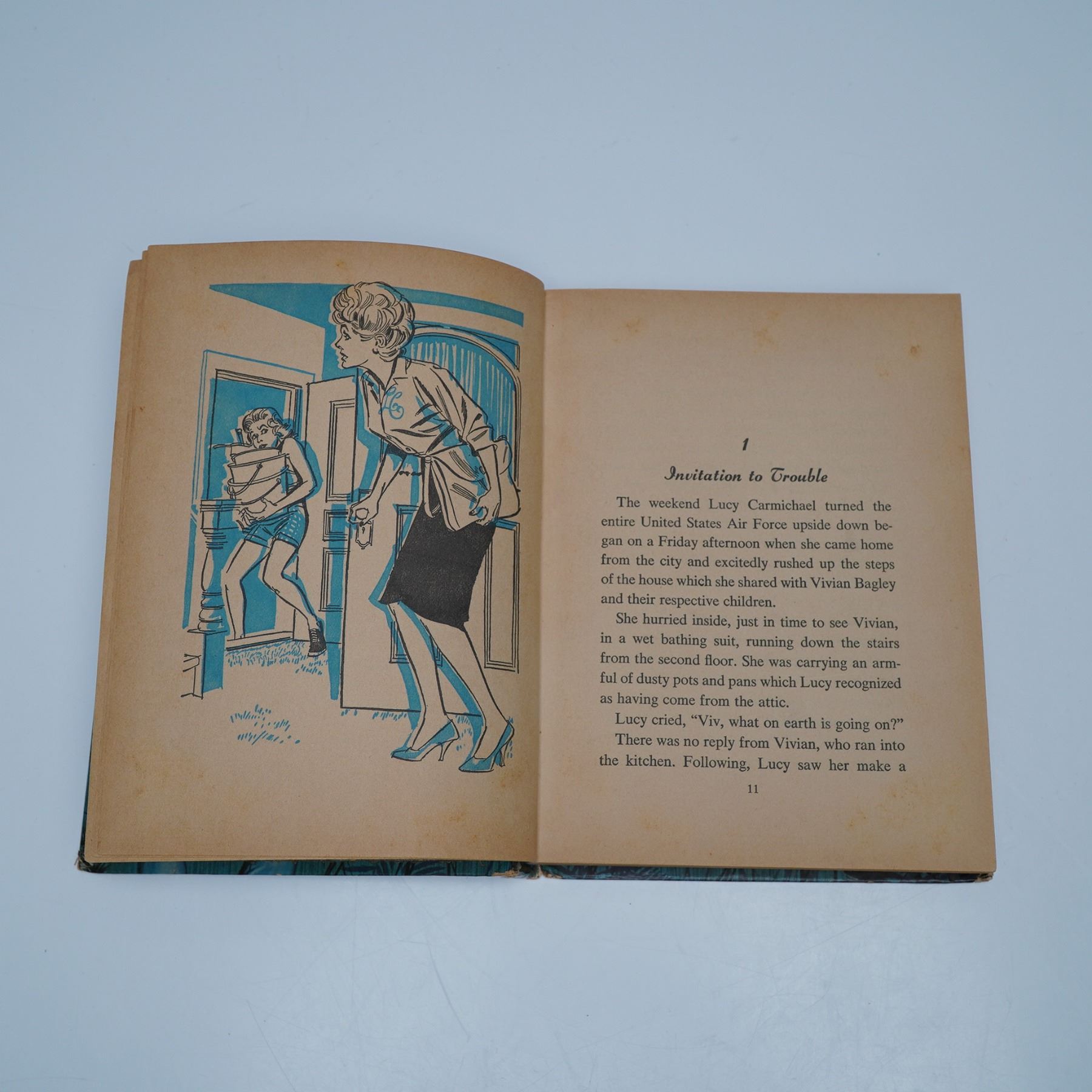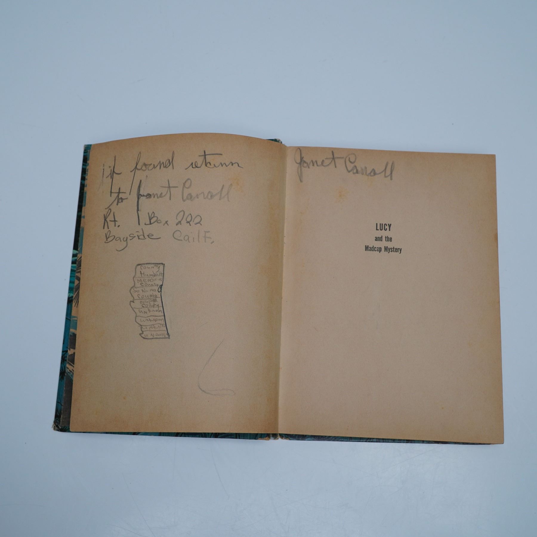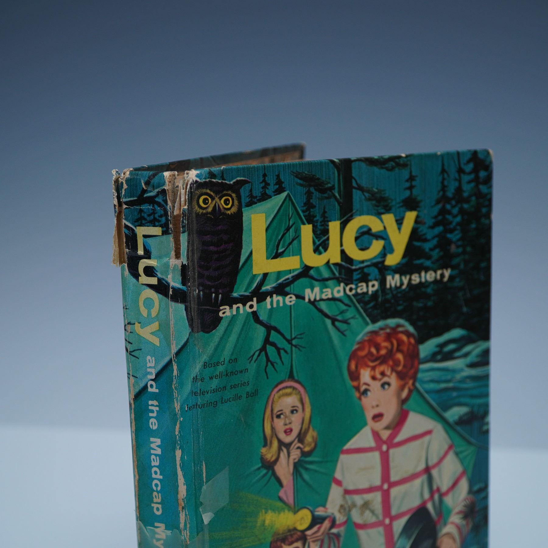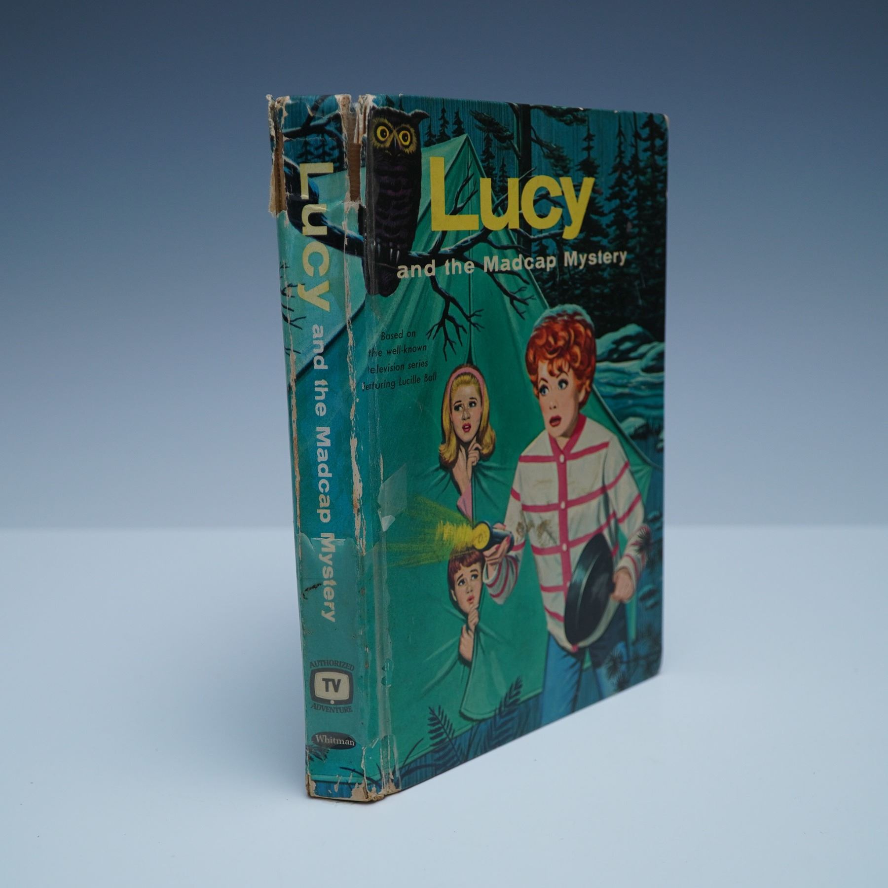 Vintage hardcover book Lucy and the Madcap Mystery, written by Cole Fannin and illustrated by Mel Keefer and Al Andersen. Published in 1965 by Whitman Publishing Company, this book is an authorized edition based on the television series starring Lucille Ball. The story follows Lucy Carmichael on an adventurous and comedic mystery. The book features a colorful illustrated cover and interior illustrations.