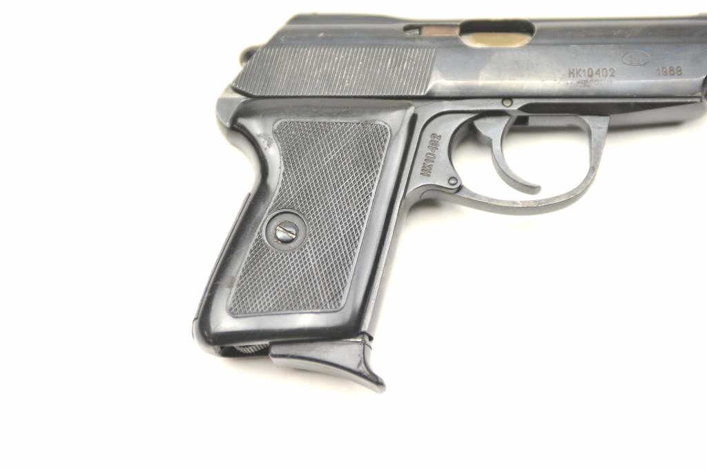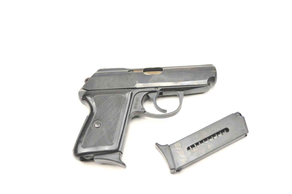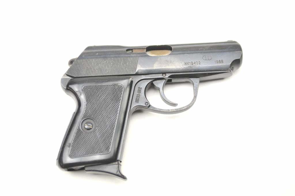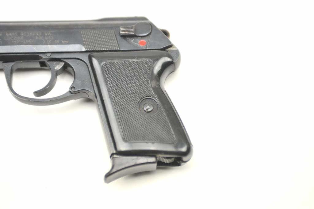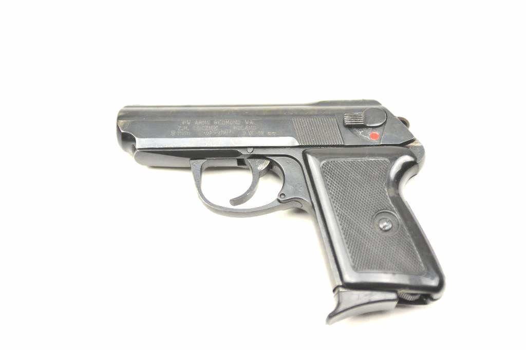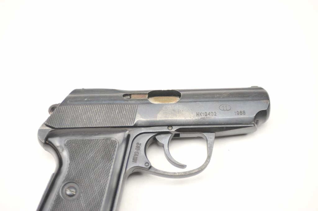 Lucznik P-64 Double Action Semi-Auto Pistol in 9x18mm. The right side of the slide is marked “HK10402 1968” and “#11” in oval (police or unit). Very good plus overall with extra mag. Good bore and mechanically sound. Unusual. (Modern/PPT) Est.: $250-$500
