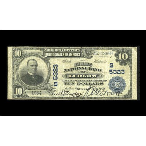 <B>Ludlow, KY</B></I> - $10 1902 Plain Back Fr. 633 <B>The First NB</B></I> Ch. # (S)5323<BR>This <B>Fine</B></I> note is one of only two large size notes listed from here in the census and is the only $10 Plain Back documented as surviving. With an outstanding large circulation of only $1,450 as of 1935 it is likely to be a long wait before another bidding opportunity arises. Tonight's example has margins all around and is signed by Assistant Cashier Snyder. Given the scarcity of this note, bids may be unexpectedly strong from this community known for its landmark railroad viaduct.