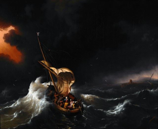 Artist: Ludolf Backhuysen - Title: Christ in the Storm on the Sea of Galilee - Medium: Fine Art Reproduction Giclee on Canvas - Image Size: Approximately 26 inches x 32 inches - Unframed on Unstretched Canvas - Biography: Ludolf Backhuysen was born in Emden, East Frisia, and came to Amsterdam in about 1650, working as a merchant's clerk and a calligrapher. He discovered so strong a genius for painting that he relinquished the business and devoted himself to art from the late 1650s, initially in pen drawings. He studied first under Allart van Everdingen and then under Hendrik Dubbels, two eminent masters of the time, and soon became celebrated for his sea-pieces, which often had rough seas.