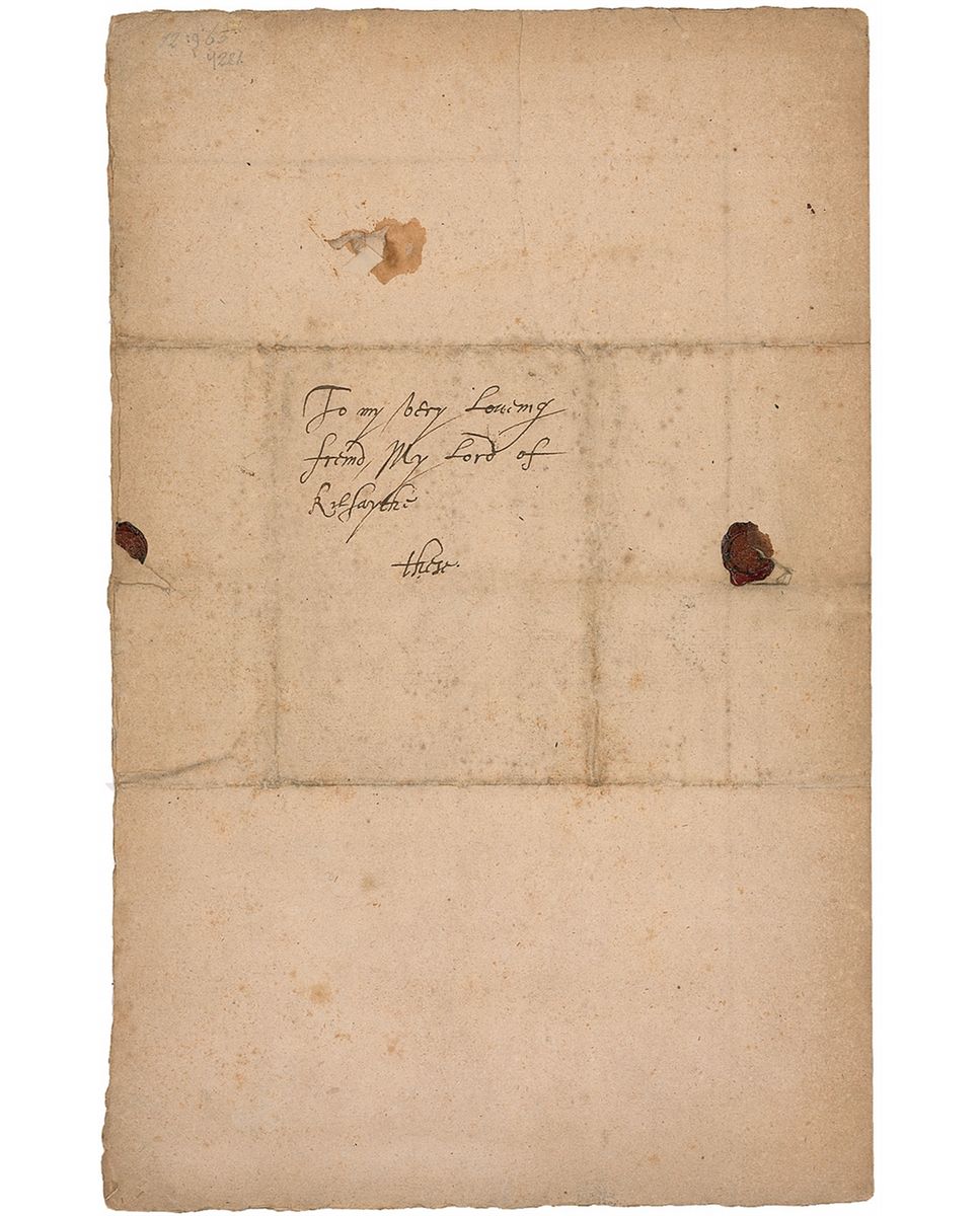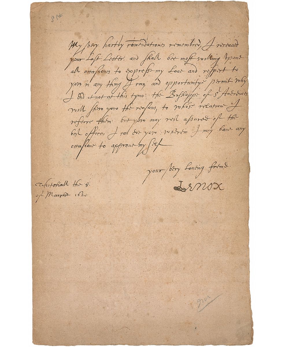 Second Duke of Lennox (1574–1624) who was involved in the colonization of the state of Maine, and being the favored cousin of King James, he served as his personal assistant. LS in Old English, signed “Lenox,” one page, 7.75 x 12.25, March 8, 1620. Letter to the Lord of Lafayette. In part: “I received your Last Letter; and shall be most willing…to express my Love and respect to you in anything I can.” Stuart goes on to mention the Bishop of St. Andrews later in the letter. Reverse of second integral page bears an address in an unknown hand and a partial red wax seal. In very good condition, with intersecting folds, one through a single letter of signature, mild toning and soiling, a few spots of foxing, and a pencil notation to bottom.