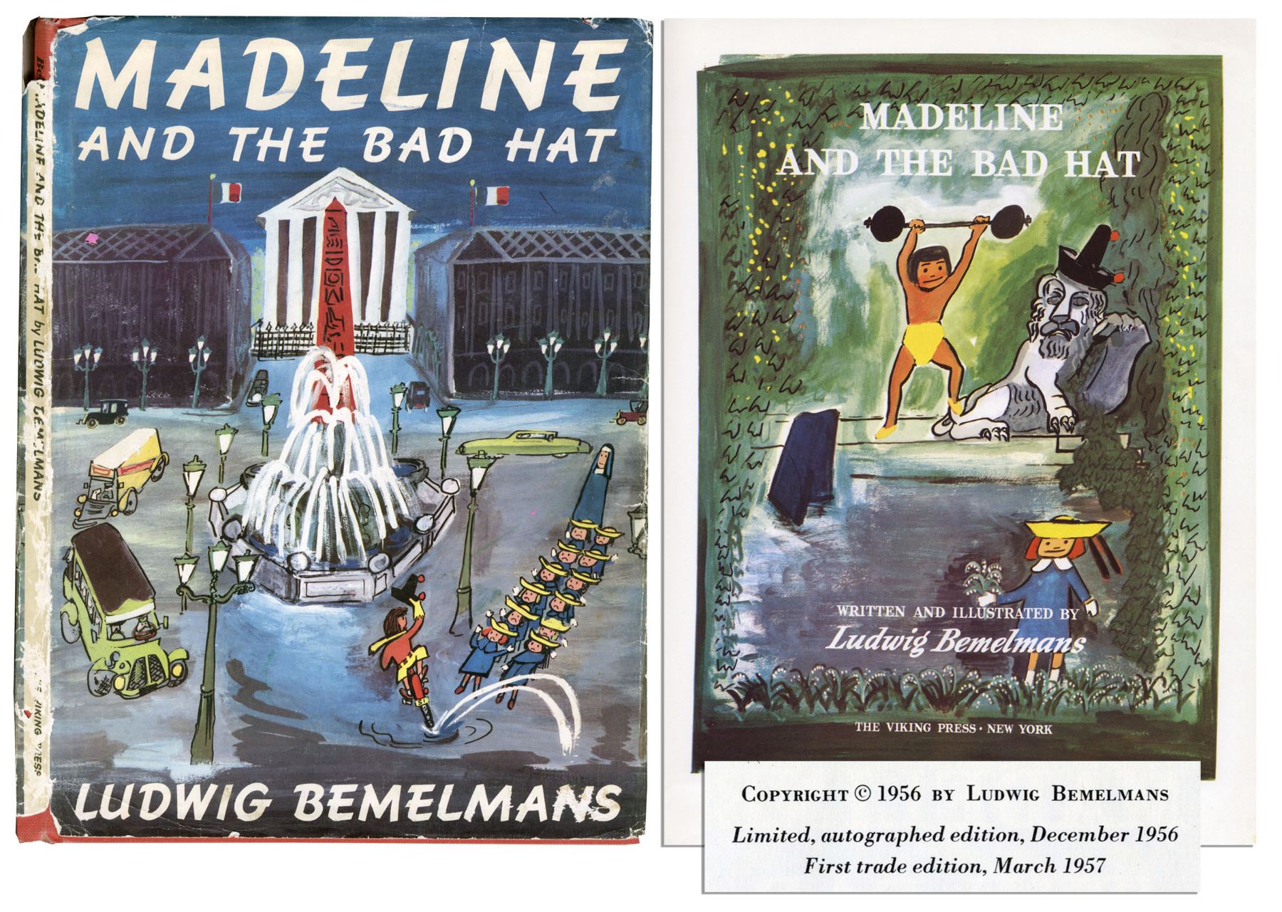 First edition of ''Madeline and the Bad Hat'' written and illustrated by Ludwig Bemelmans. The Viking Press: New York: 1957. The original dust jacket bears the price of $3.50. The classic 54pp. children's story is set in Paris and depicted vibrantly by Bemelmans' artwork. Bound in red cloth boards with colorful illustrated endpapers. Measures 9'' x 12.25''. Bumping to board corners and light soiling to leaves. Near fine. Chipping to dust jacket folds and spine, and paper loss to backstrip, else very good.