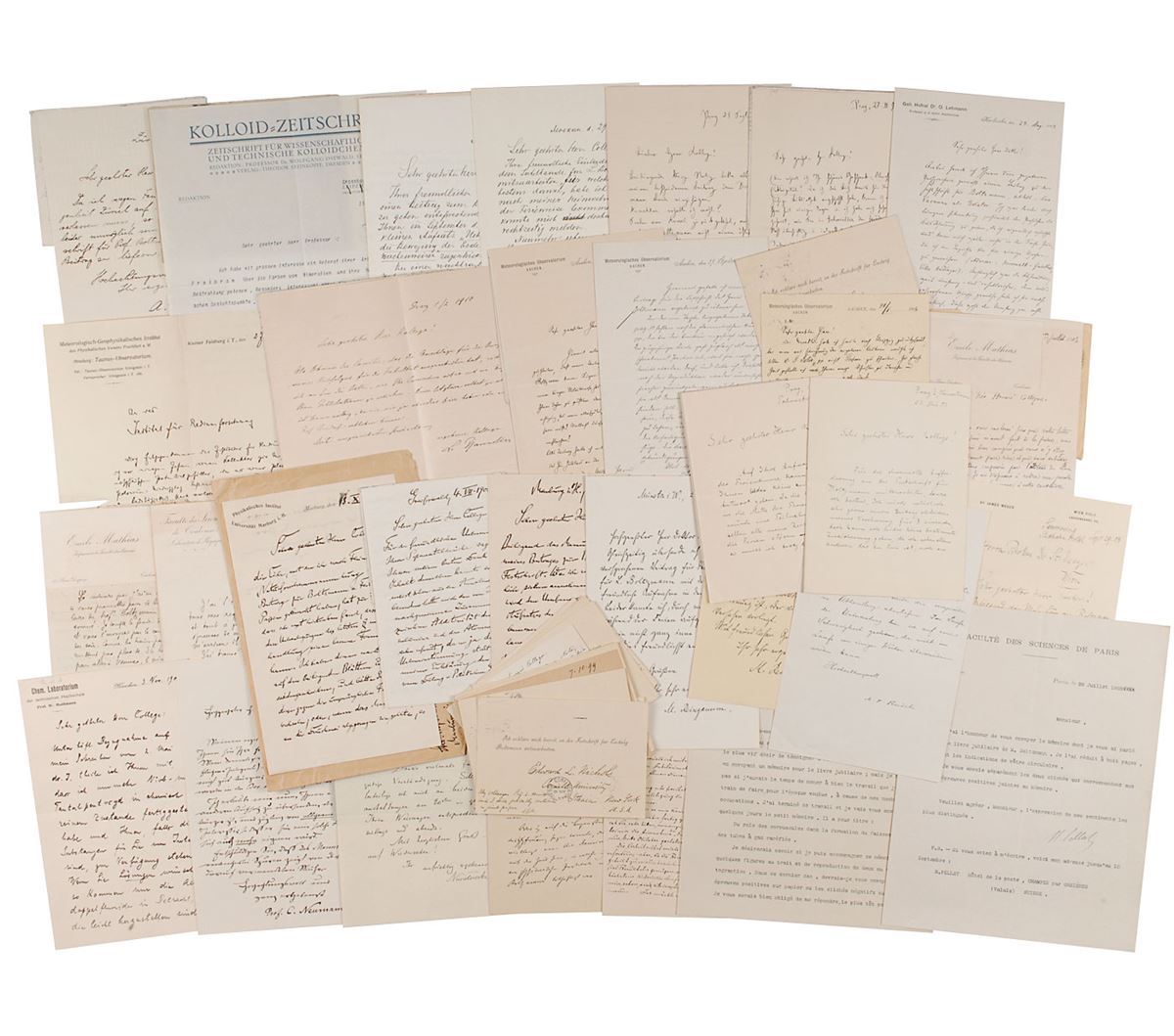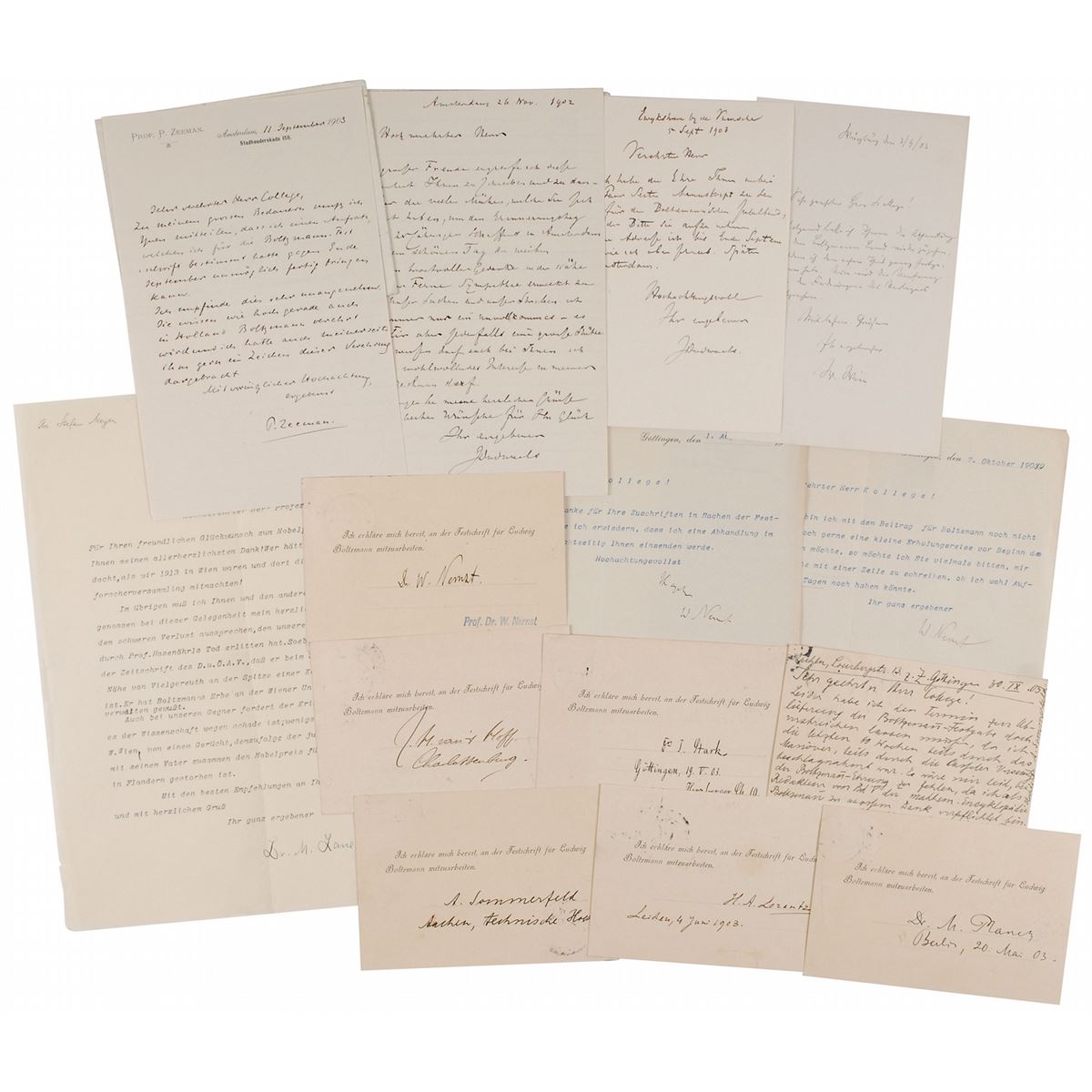 Spectacular archive of approximately seven hundred letters and reply postcards sent to Austrian physicist Stefan Meyer in response to an invitation to contribute to a commemorative publication honoring his mentor Ludwig Boltzmann. The collection consists of approximately two hundred of these reply postcards signed by various scientists and a large corpus of correspondence with content concerning submitted articles and other material related to the publication, all circa 1903. Includes autographs of the following physicists and mathematicians: Max Planck, Arnold Sommerfeld (2), Johannes Diderik van der Waals (2), Gottlob Frege (3), Karl Exner, Jacobus Hendricus van’t Hoff, Max von Laue, Hendrik Lorentz, Pieter Zeeman, Otto Lehmann, Wilhelm Wien, Johannes Stark, Walther Nernst (3), Hantaro Nagaoka, Gustav Mie, Wilder D. Bancroft, Ivan Borgman, Paul Drude, Vilhelm Bjerknes, Carl Neumann, Pierre Duhem, Pyotr Lebedev, Friedrich Ernst Dorn, Karl Fischer, Cargill Gilston Knott, Horace Lamb, Johannes van Laar, Ernest Merritt, Egon Schweidler, Carl David Tolme Runge, Ludwig Stickelberger, Augusto Righi, Arthur Moritz Schoenflies, and Rudolf Wegscheider. In overall fine condition.