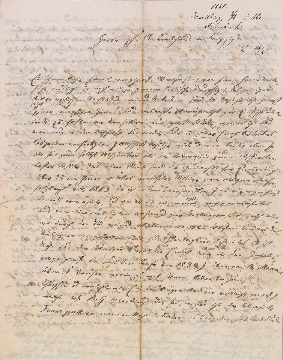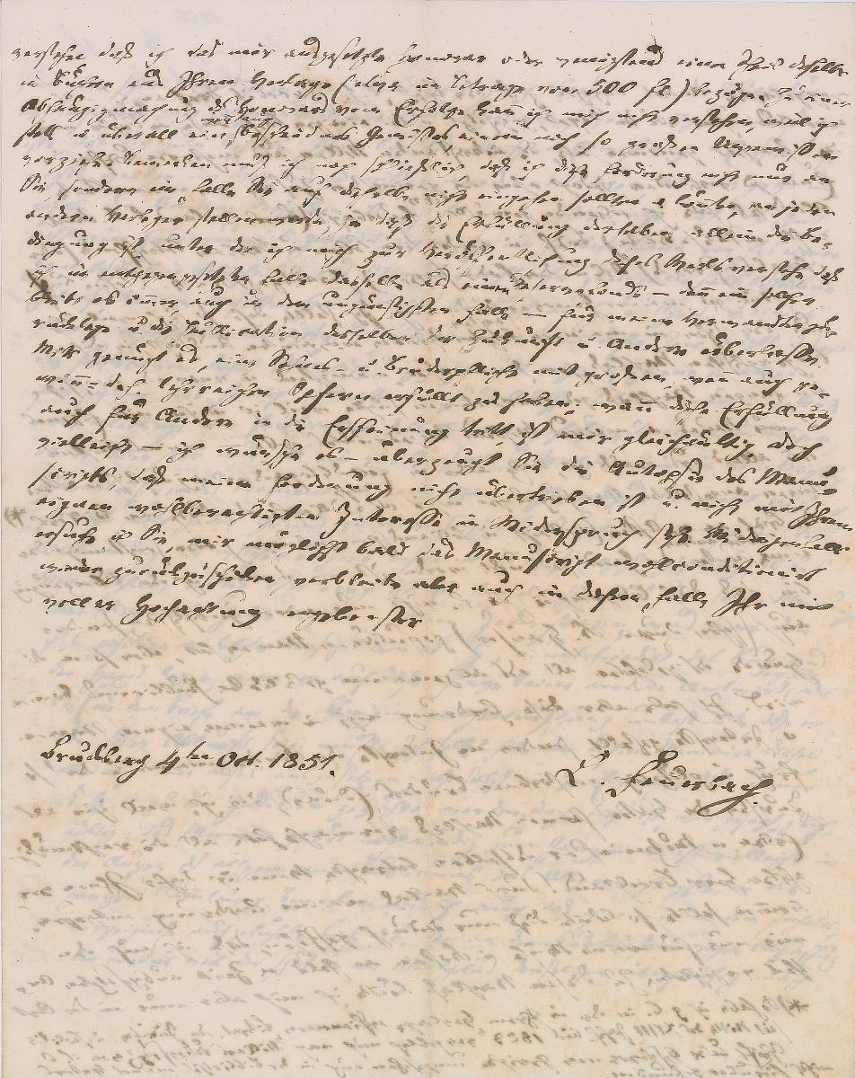 German philosopher and anthropologist (1804–1872) whose book The Essence of Christianity influenced the minds of Karl Marx and Friedrich Engels. Lengthy ALS in German, signed “L. Feuerbach,” four pages on two adjoining sheets, 8.25 x 10.5, October 4, 1851. Mostly untranslated letter to the publishing house Brockhaus concerning the manuscript for Paul Johann Anselm Ritter von Feuerbach’s Life and Work, published by his son Ludwig Feuerbach, stating that two parts are missing, one of them being “the document presented to Queen Caroline…concerning K. Hauser, in which F. finds probable cause that K. H. really is the one the rumor, namely in Baden, says he is…Personally, I see only one fault in the document: the fact that even some of K. H.’s dreams are taken as evidence, but that is of no importance: this document is an essential part and may well be the most important piece of all in the collection.” Central vertical and horizontal folds with a stain to the first sheet, and show-through from writing to opposing sides, otherwise fine condition. Ludwig Feuerbach’s father, Paul Johann Anselm Ritter von Feuerbach, was an eminent German legal scholar who played a major part in the influential reform of the Bavarian penal code.
