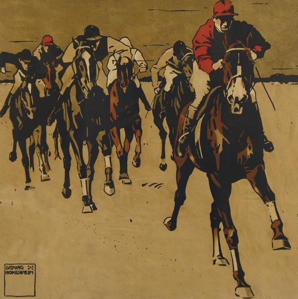 German [1874-1949] REITER IM RENNEN (HORSE RACE); 1909 colour lithograph on paper 14 x 14 in. (35.6 x 35.6 cm) signed in the print