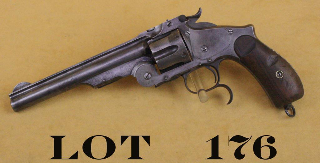 Ludwig & Loewe copy of a Smith & Wesson Model 3 Russian Third Model Single Action revolver, .44 cal., 6-1/2” barrel, blue finish, smooth wood grips, #6593. This gun is in overall good condition showing severalslight traces of original blue in protected areas with the balance a light gray patina that has come back over an earlier cleaning of metal surfaces with some spots of erosion and pin prick pitting; good bore, action andmarkings, wood grips are overall good with an old large ding on the left grips and some smaller nicks and mars from carry and storage. This is a “commercial” example of the Ludwig & Loewe copy of the Smith & Wesson under Russian contract with barrel address in English, not Cyrillic (as with contract military guns produced for the Russians). Hard variation to find in any condition. Est.: $1,500-$2,500.