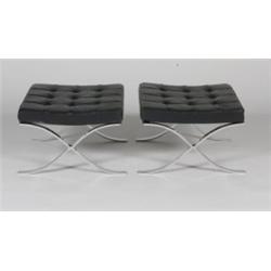 Pair of "Barcelona" stools,<BR>black leather and chrome.<BR> Manufacturer unknown, designed 1929 (these produced circa 1980) 22”w x 23”d x 15”h