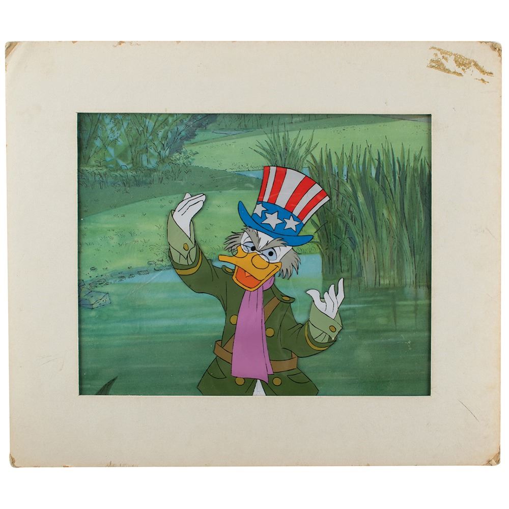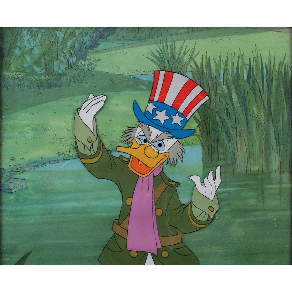 (Walt Disney Studios, 1960s) Original production cel featuring Professor Ludwig Von Drake from a Fourth of July special episode of Walt Disney's Wonderful World of Color, showing him in an Uncle Sam–style top hat. The cel is placed on a Disney litho background. Image measures 5 x 6.5, with a mat opening of 10 x 8. Matted to an overall size of 14 x 12. Reverse of the backing bears a gold label stating that it is an original hand-painted celluloid actually used in a Walt Disney production, and was released exclusively at Disneyland. In fine condition, with some staining and edgewear to the mat.