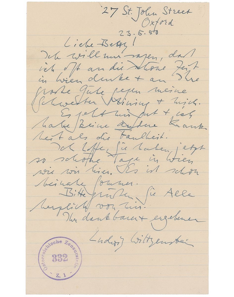In 1950, three years after resigning his professorship at Cambridge to concentrate on his writing, Wittgenstein was diagnosed with incurable prostate cancer—a fact that he seemingly kept to himself when he returned to his family home to visit his dying sister Hermine at the start of the year. “I can assure you that I suffer of no other disease than plain laziness,” he writes to the family’s longtime housekeeper, thanking her for her kind treatment of his sisters and shrugging off his own troubles. Following Hermine’s death in February, he stayed with various friends—G.H. von Wright in Cambridge during April, then Rush Rhees in London, and finally Elizabeth Anscombe in Oxford, where he wrote this letter. He then returned to Cambridge, where he began work on his final manuscripts—posthumously published as Remarks on Colour and On Certainty—before passing away at the end of April in 1951. A charmingly cheerful letter from the influential philosopher, exuding the positivity that he found in his final days, which ended with the touching remarks, ‘Tell them I've had a wonderful life.’