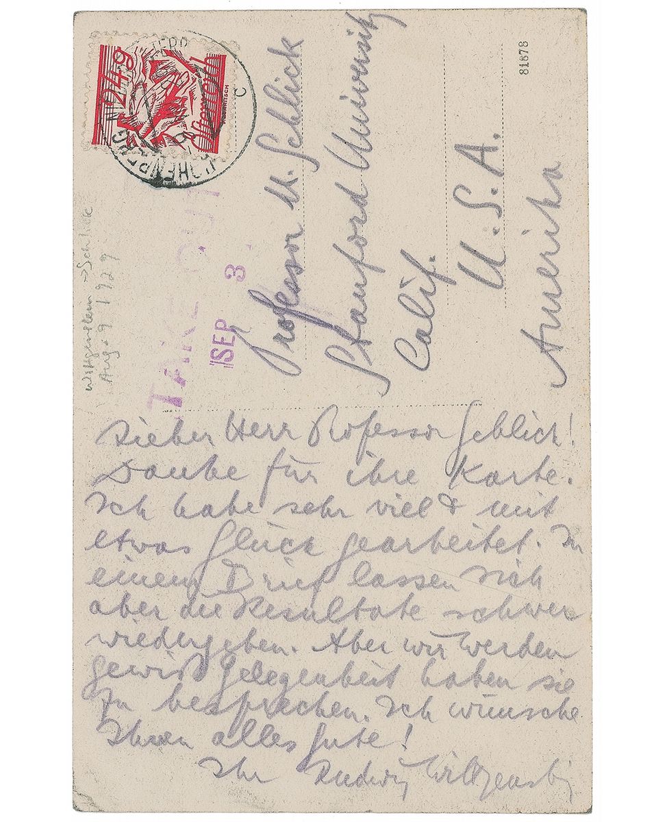 Highly influential Austrian-British philosopher (1889–1951) whose greatest contributions were in the fields of logic, philosophy of mathematics, and language. Rare ALS in German, one page on a 5.25 x 3.5 postcard depicting a winter scene, postmarked August 9, 1929. Letter to important philosopher and physicist Moritz Schlick. In full (translated): “Thank you for your card. I have worked a lot & with a little luck. I will send you a letter but the results are difficult to communicate. But we will have to find opportunity to discuss them. I wish you all the best!” In fine condition, with trivial creasing to corner tips.