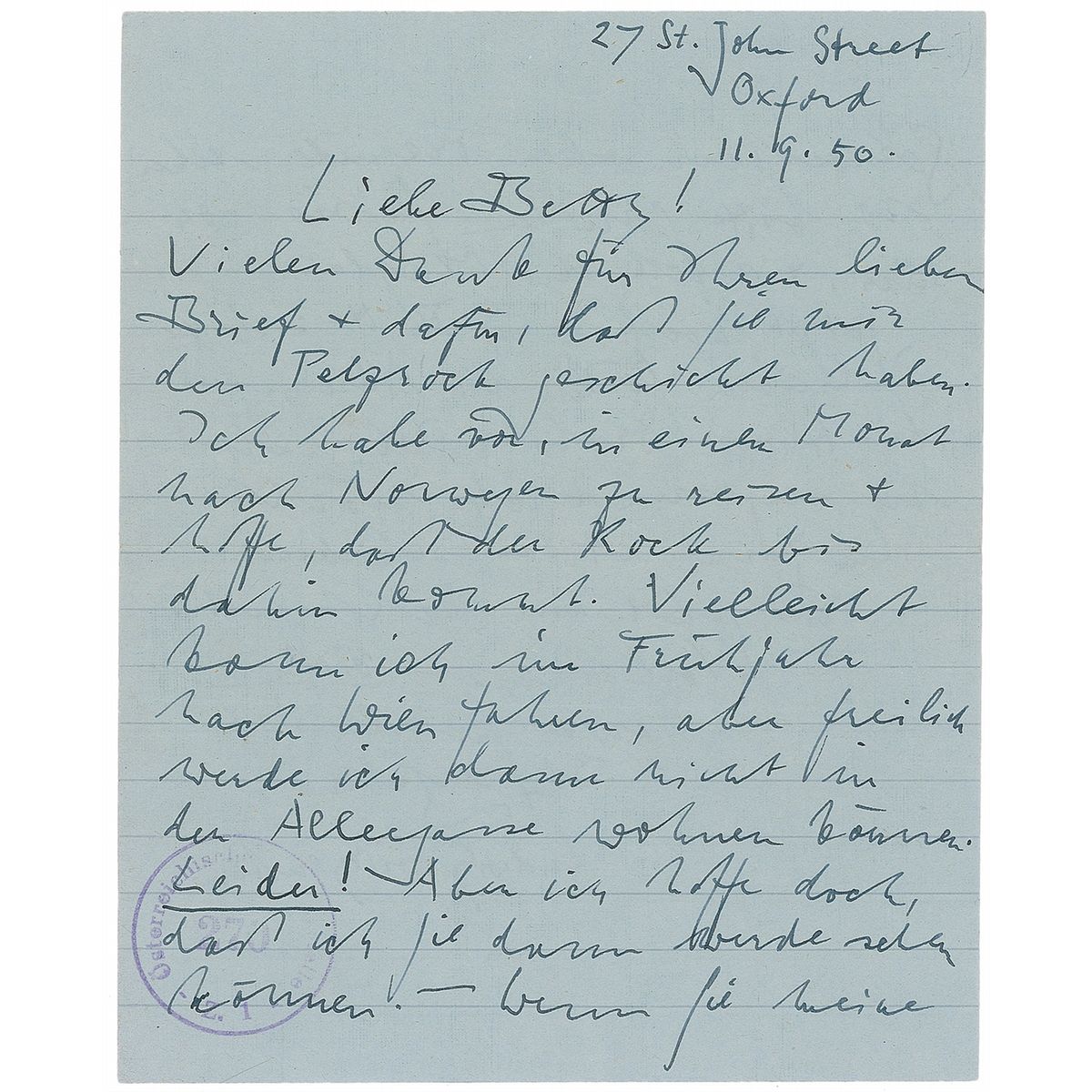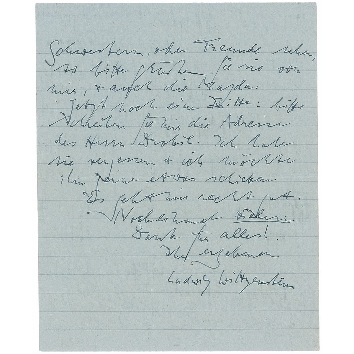Highly influential Austrian-British philosopher (1889–1951) whose greatest contributions were in the fields of logic, philosophy of mathematics, and language. ALS in German, one page both sides, 5 x 6.25, September 11, 1950. Letter to Betty Gaun, longtime housekeeper to the Wittgenstein family. In part (translated): “Thank you for your kind letter & for sending the fur coat. I intend to travel to Norway in a month and hope that the coat will arrive by then. Perhaps I can come to Vienna in spring, but of course I will not be able to stay at Alleegasse. Unfortunately! But I do hope that I will see you then. If you should happen to see my sister, or friends, then please give them my regards, & also Magda. And now another request: please send me Mr. Drobil’s address. I have forgotten it & would like to send him something.” In fine condition. Wittgenstein had become acquainted with the sculptor Michael Drobil (1877–1958) during their days together at a prisoner-of-war camp in Italy at the end of World War I. He introduced Drobil to his sister Hermine, who commissioned several works including a sculpture for the hallway of their parents’ palace at Alleegasse.