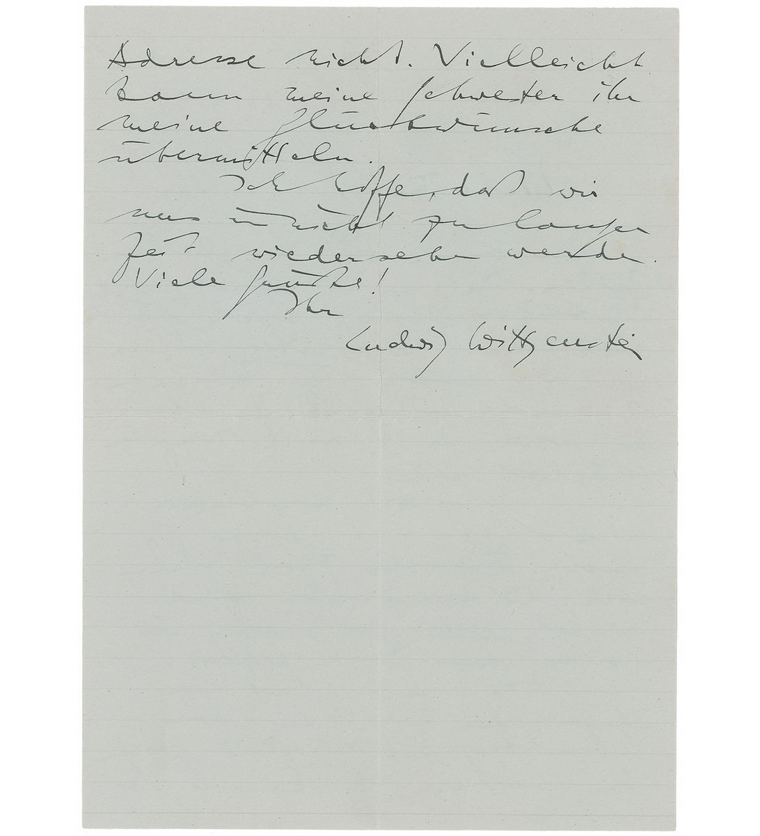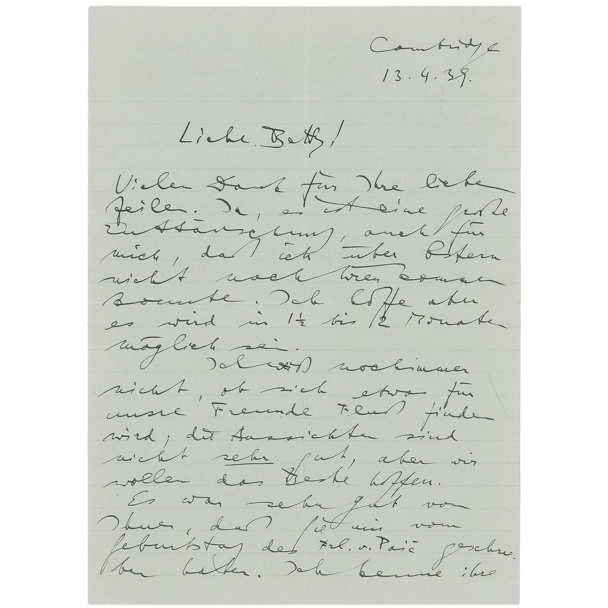 ALS in German, one page both sides, 6.75 x 9.25, April 13, 1939. Letter to Betty Gaun, longtime housekeeper to the Wittgenstein family. In part (translated): “Thank you for your kind words. Yes, it is a great disappointment to me that I could not come to Vienna on Easter. But I hope it will be possible in 1 1/2 to 2 months…It was very good of you to have written to me of the birthday of Miss V. Paie. I do not know their address. Maybe my sister can forward her my congratulations.” In fine condition, with central vertical and horizontal folds.