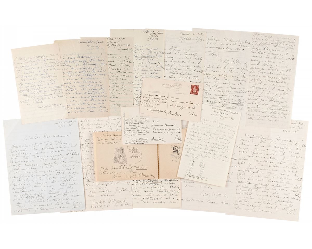 An important archive of unpublished letters from Wittgenstein to one of his closest friends and confidantes, Hermann Hansel, comprised of sixteen ALSs, totaling 24 pages, primarily dated between 1937 and 1951, mostly from the World War II period. The two had met while prisoners of war at Monte Cassino during World War II and kept in close contact throughout the rest of their lives. On April 13, 1938, one month after the ‘Anschluss’ in which Austria was annexed by Nazi Germany, Wittgenstein writes (translated): "Do not let yourself be confused over religion by its representatives; but do not let the ideals of a religion delude you as to the actual views of its representatives, either. I will probably not be visiting Austria again in the next months. If I did, I might not get out again, and that would be a great misfortune for me…As you see, I am back at Cambridge, and will be teaching again next trimester.”