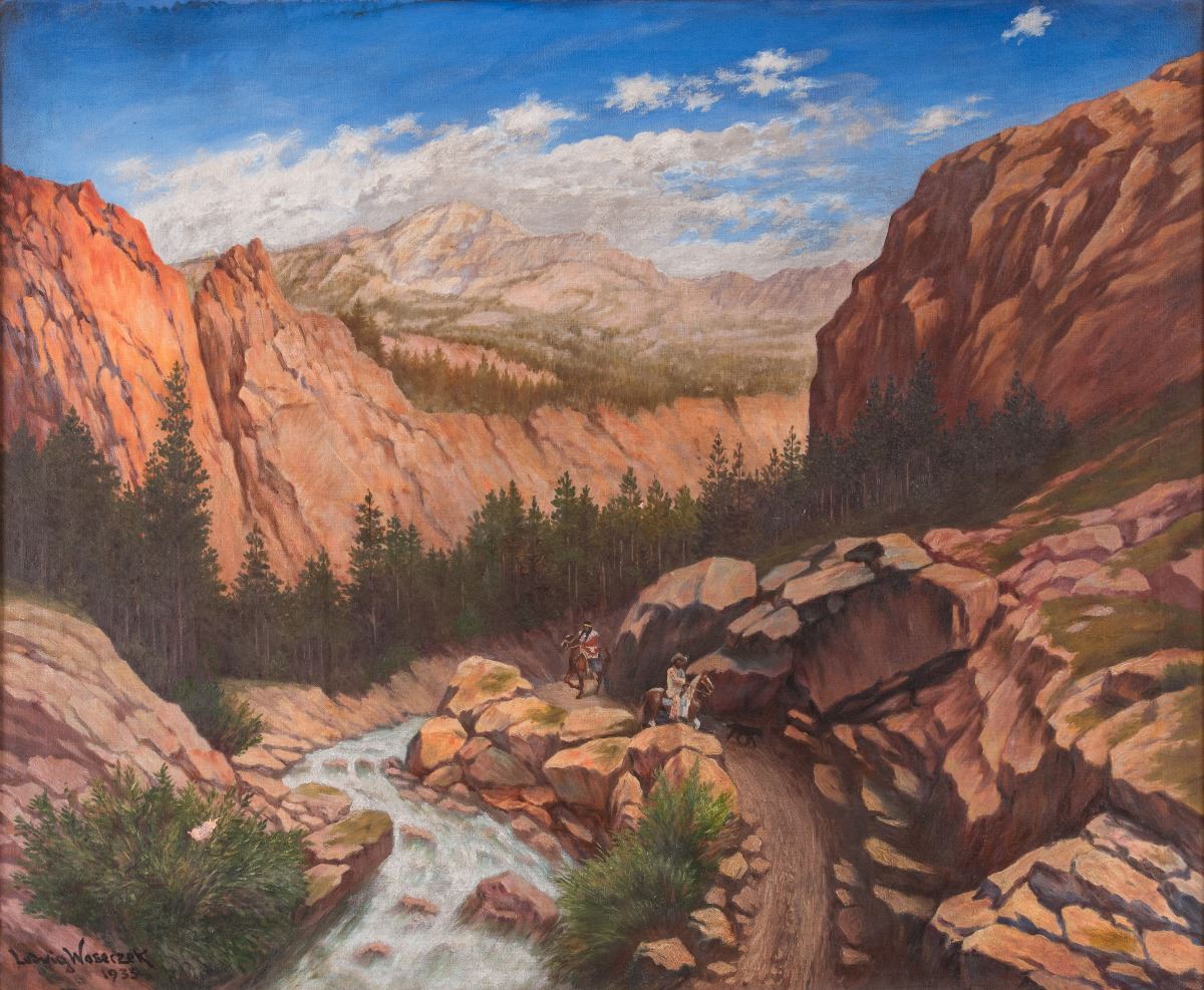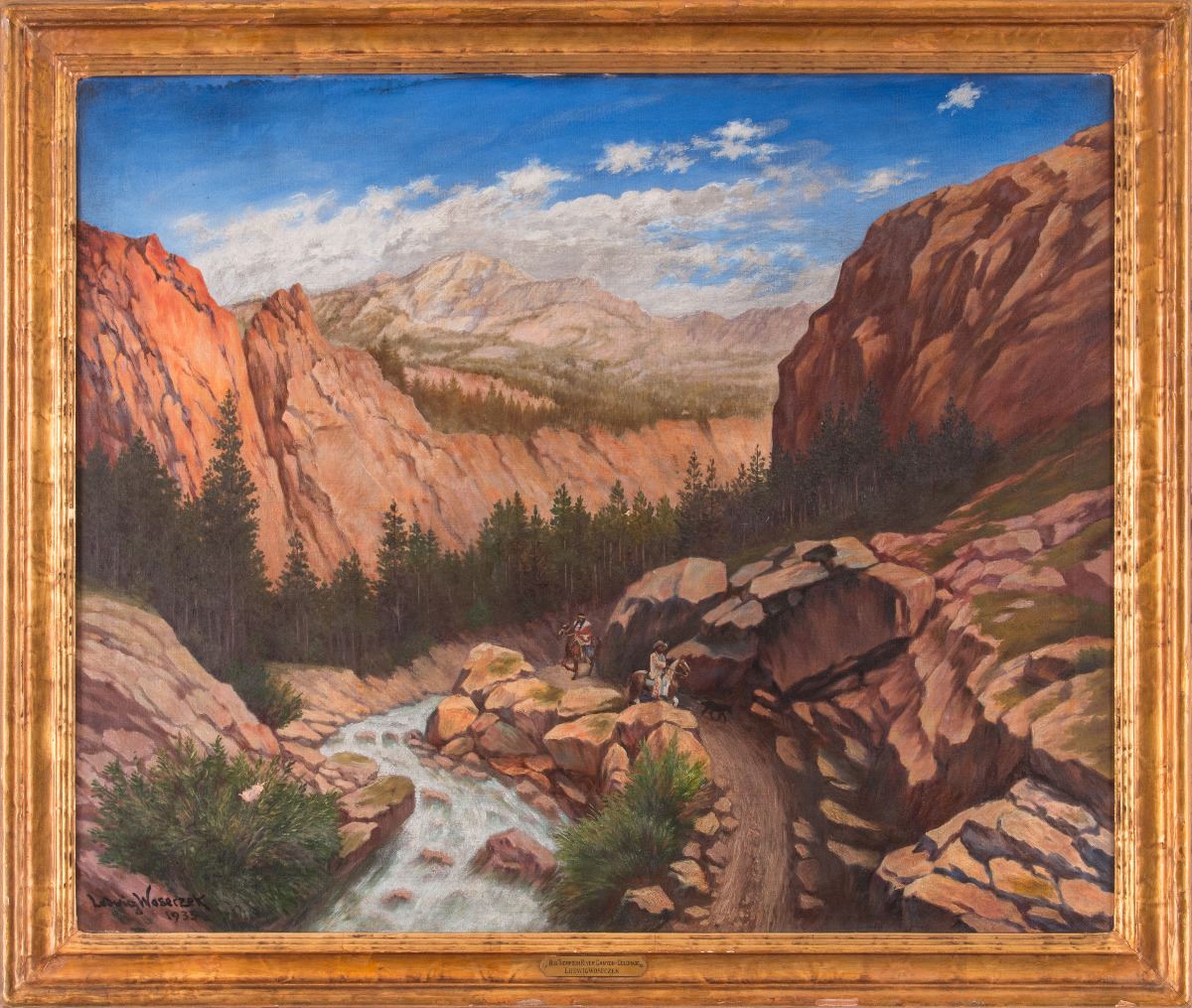 Ludwig Woseczek. Big Thompson River Canyon. 38" x 32" oil on canvas. Signed and dated 1935 lower left.