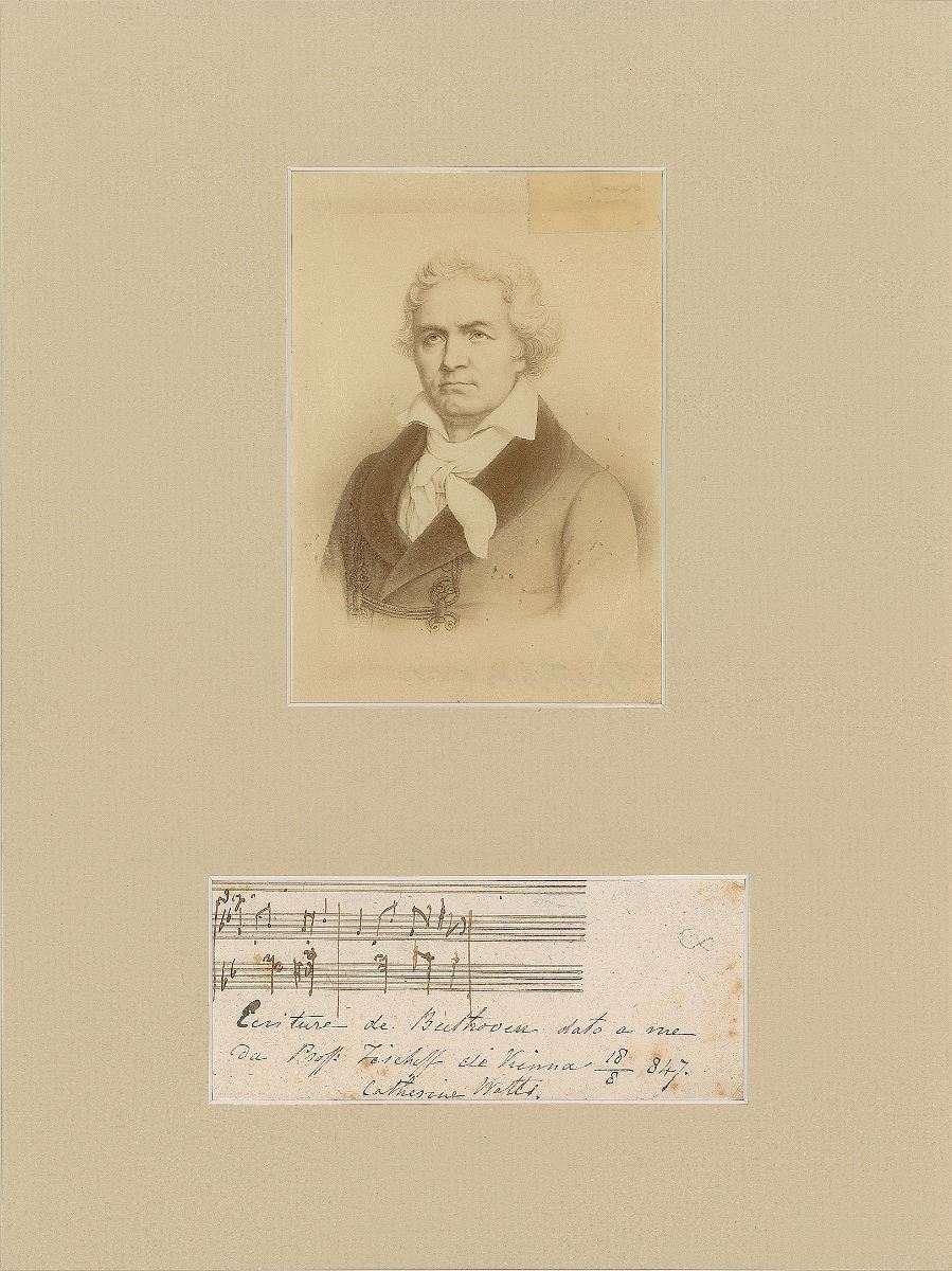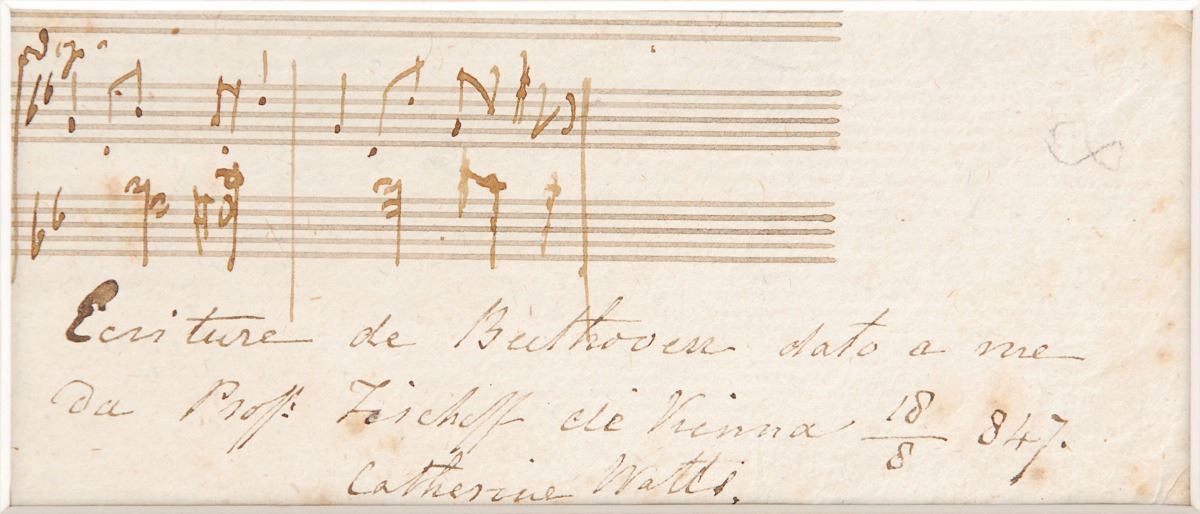 Remarkable unsigned AMQ on both sides of an off-white 5 x 2 leaf fragment, consisting of a previously unrecorded and unpublished work, inscribed below in French and Italian [translated], “Writing of Beethoven given to me by Proff. Fischoff of Vienna, 18/8/847, Catherine Watts.” The front features two measures of music in G minor marked “Adagio” and scored for piano keyboard in the character of a lament, and is highly expressive in the way in which the serious character of the first measure is heightened through the move to the augmented-sixth chord with motivic intensification in the second measure; the reverse is comprised of a double system, both in bass clef and in the key of E flat, showing two and half bars of an arpeggiated figure in E flat major, with a partial third stave of music above. Matted with a portrait of Beethoven to an overall size of 9 x 12; reverse of mat remains open for viewing of opposite side. In very good to fine condition. Accompanied by an engraving of Beethoven with a preprinted signature.