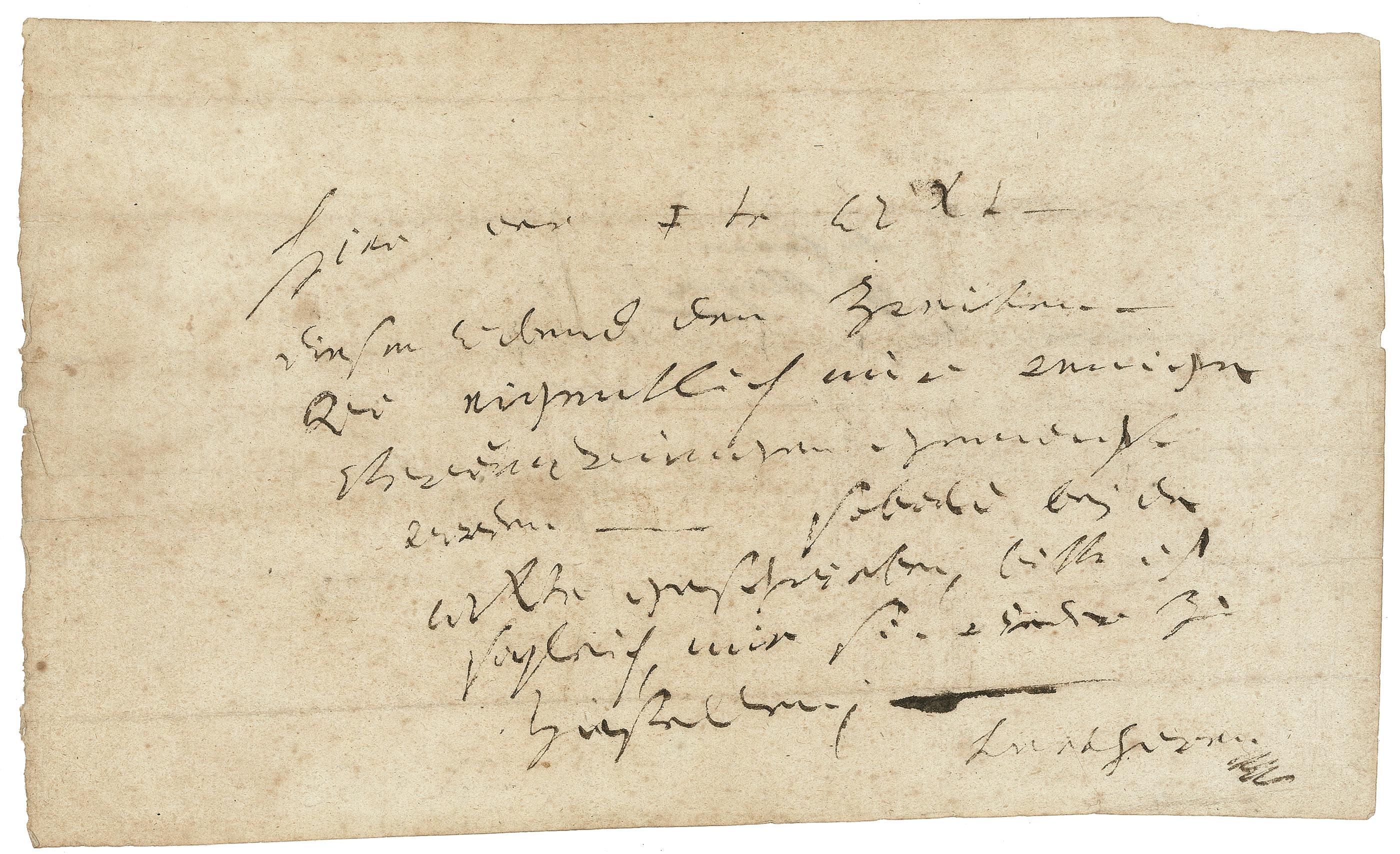 Monumentally significant German composer (1770–1827), who, through the genius manifested in nine completed symphonies, 32 piano sonatas, and all manner of choral, orchestral, chamber, and instrumental music, has been granted a place in history as among the most innovative and influential creative artists in the history of Western civilization. Rare ALS in German, signed “Beethoven,” one page, 9.75 x 5.75, no date, but early November 1805. Letter to Friedrich Sebastian Mayer, the bass-baritone singer who sang the role of Don Pizarro in the premiere of Beethoven’s opera Fidelio (then titled Leonore). In full (translated): “Here [is] the 1st act. Tonight the second where actually only a few changes [have been] made. As soon as both acts are written, I ask to have them sent back to me promptly.” In very good condition, with intersecting folds, some scattered creasing and wrinkling, and some mild toning.