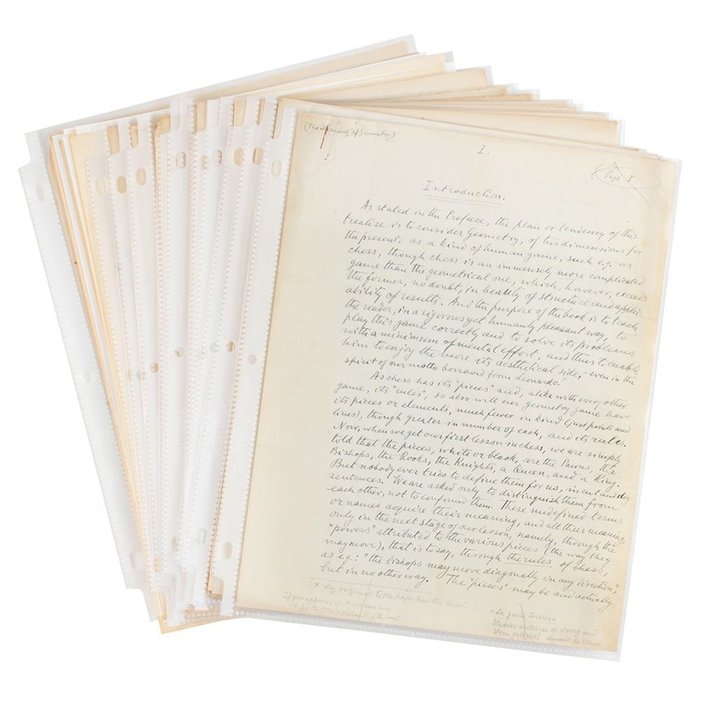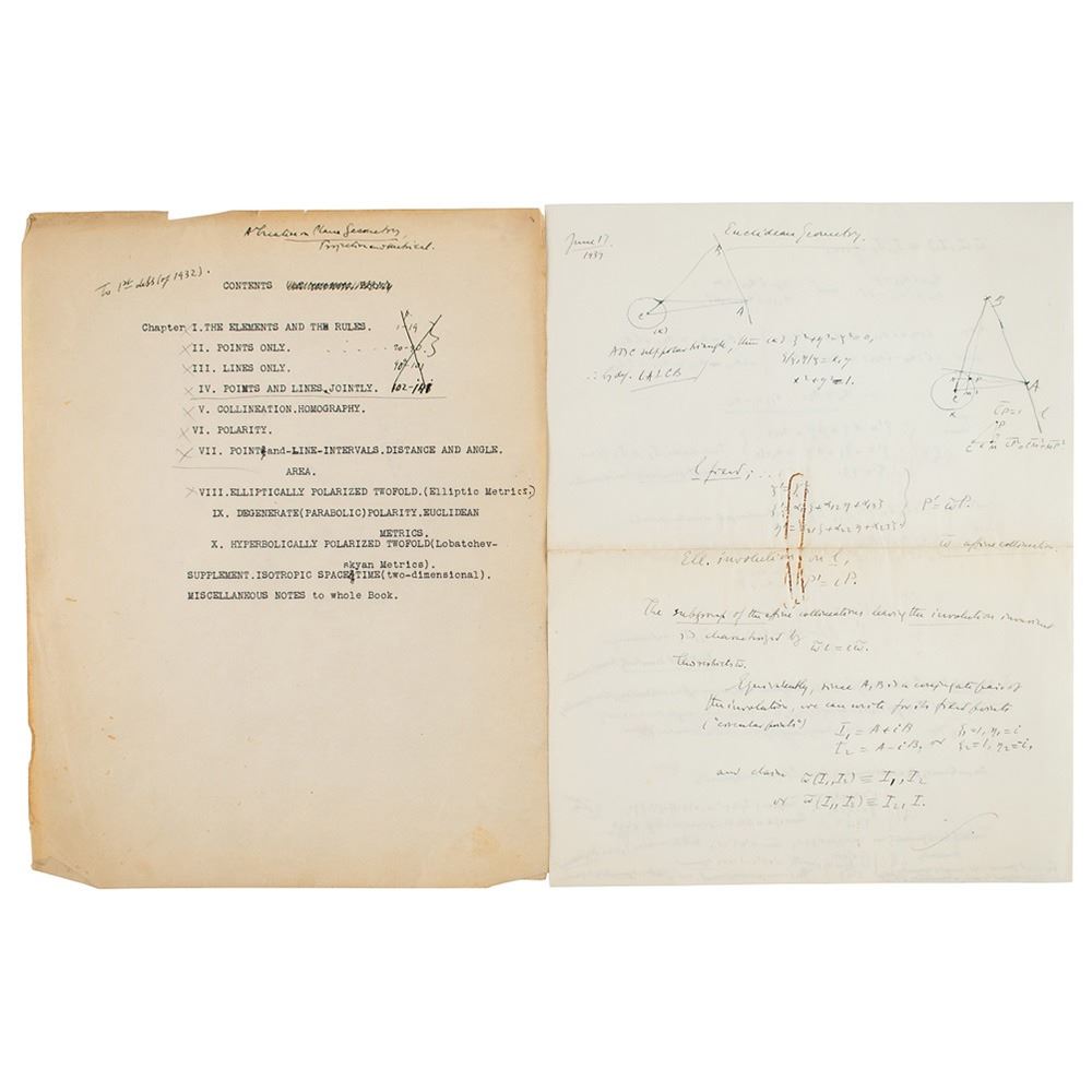 Very lengthy unsigned handwritten manuscript by Dr. Ludwik Silberstein entitled "A Treatise on Plane Geometry," numbered as 223 pages (pages 29–32 missing), 8.5 x 11, with chapter headings such as "Projectivities in One-Dimensional Forms, Conics," "Collineation, Correlation," "Polarity," "Elliptic Geometry," and "Affine Geometry." In the eloquent introduction, Dr. Silberstein outlines his objective: "The plan or tendency of this treatise is to consider Geometry, of two dimensions for the present, as a kind of human game, such e.g. as chess, though chess is an immensely more complicated game than the geometrical one, which, however, exceeds the former, no doubt, in beauty of structure and applicability of results. And the purpose of the book is to teach the reader, in a rigorous yet humanly pleasant way, to play the game correctly and to solve its problems with a minimum of mental effort, and thus enable him to enjoy the more its aesthetical side." In overall fine condition, with toning to some pages.