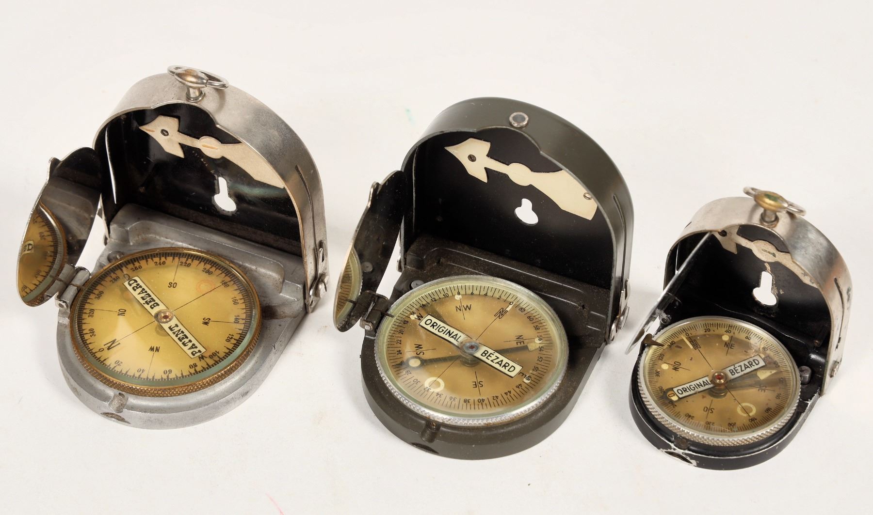 There are three compasses in this group. All Bezard-Kompasses with sight window. Complete with a box and leather carry pouches, cloudy lens. One in working condition. From the Popovich collection. Please see photo for details.