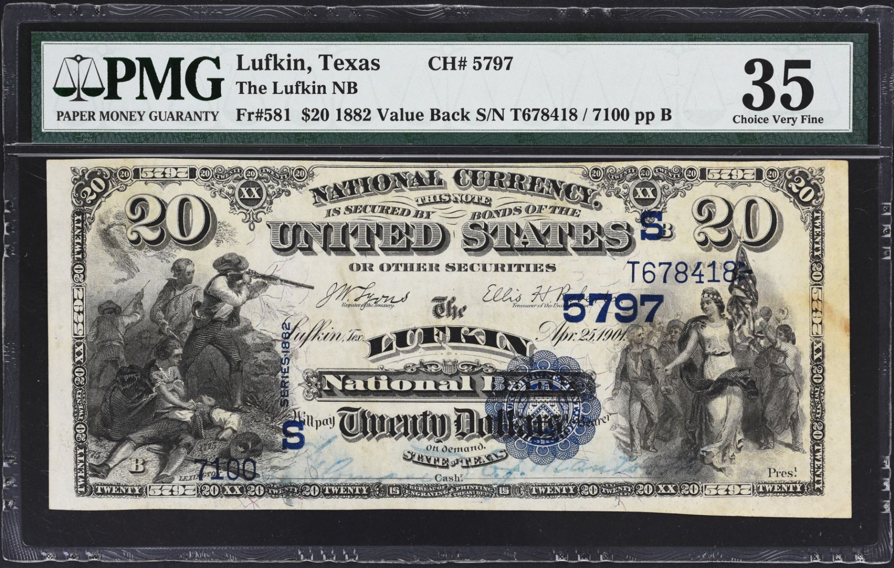 Always a scarce type and this $20 value back is one roughly 70 or so for the entire state of Texas. Beyond the statewide rarity this Angelina County town is particularly difficult as well with only two issuing banks. This Lufkin National Bank is known by just 16 large-size with only two being these desirable $20 value backs. The other charter in town shows a total population of five notes making a total of just 21 for Lufkin. Near Extremely Fine quality is offered here with strong detail and just a stain at left with PMG commenting "Stain," on the back of the holder.