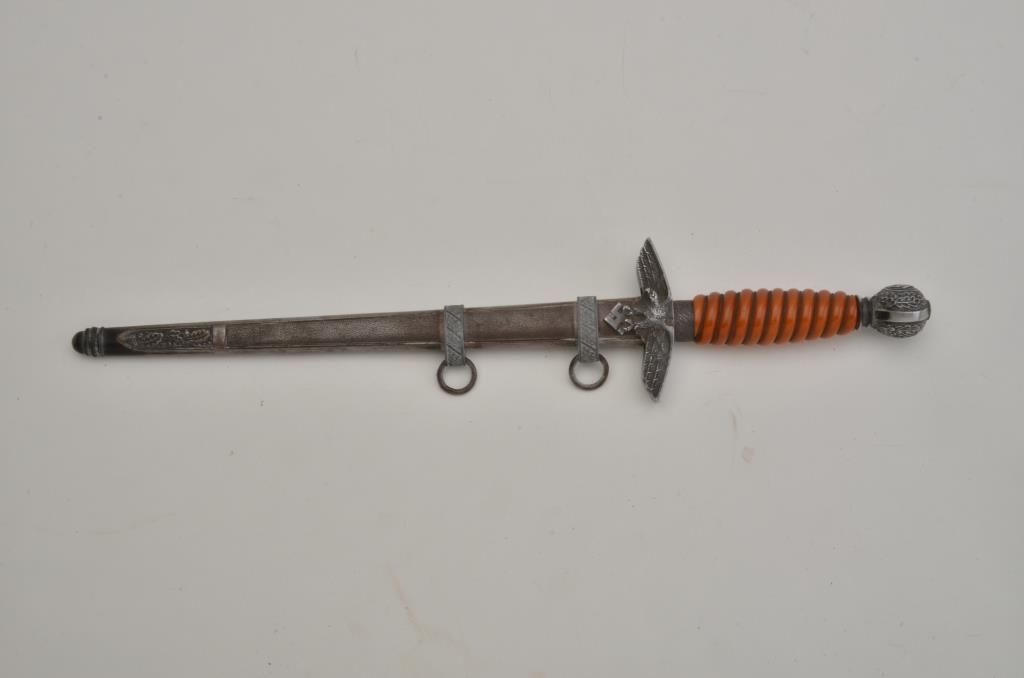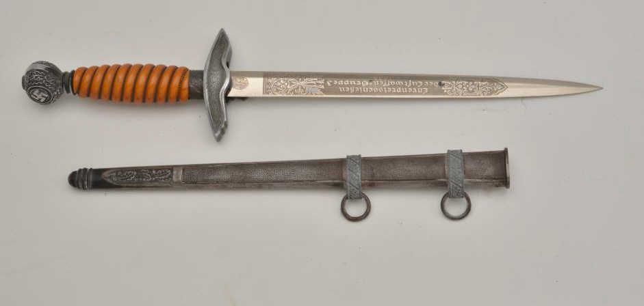 Luftwaffe 2nd Model dagger and sheath with etched and inscribed Carl Eickhorn blade in overall very good condition showing a pleasing patina and the inscription “Ehrenpreisschieken der Luftwaffen – Gruppe3”. Est.: $500-$1,000.
