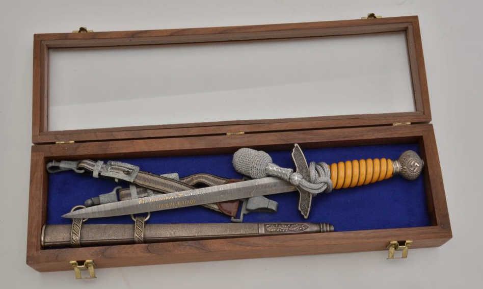 Luftwaffe 2nd Model dagger and sheath with hanger and knot in wood and glass display case in overall very good condition with inscribed blade “Fur besondere Tapferkeit im Luftkampt” on one side of the blade and“Ltn.Edgar Fennebring”. Est.: $500-$1,000.