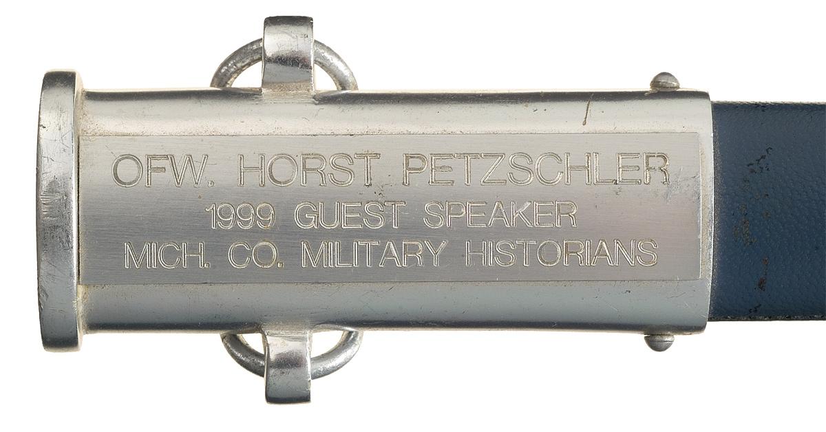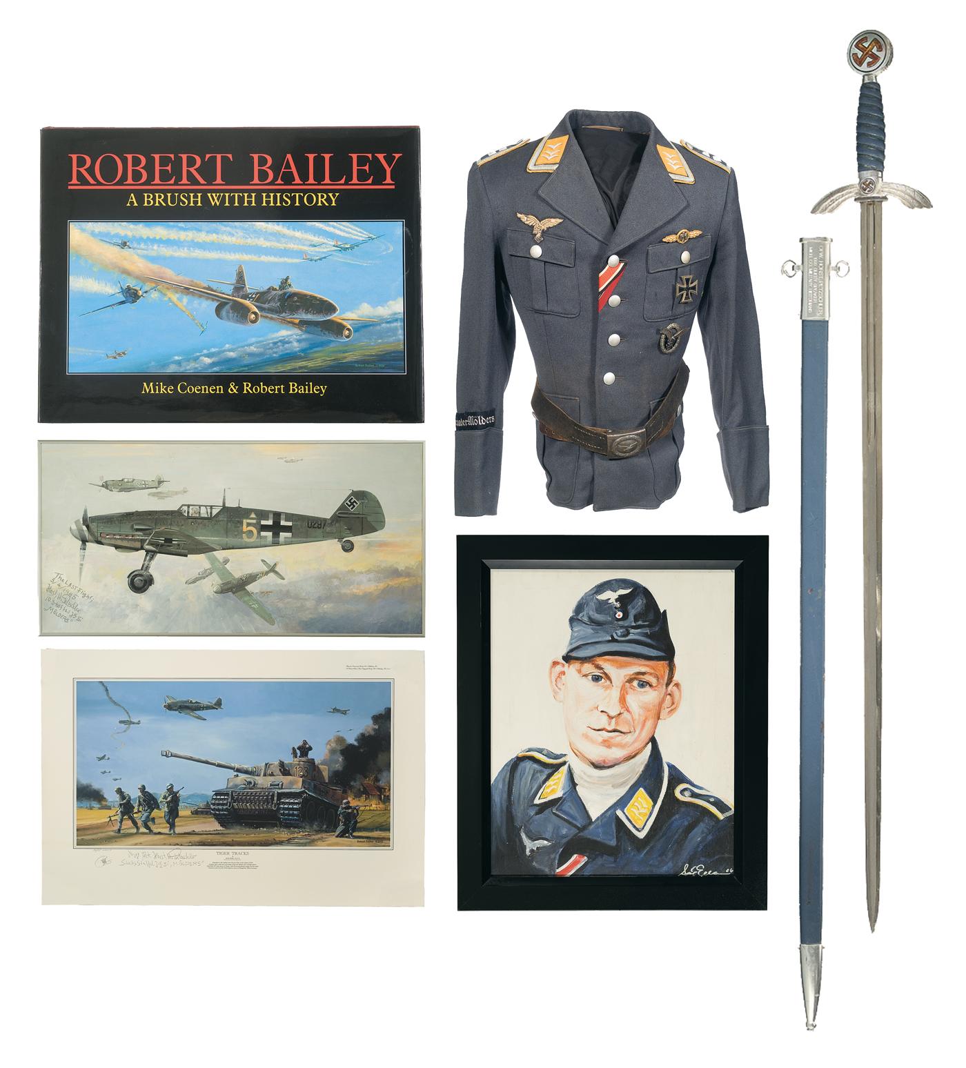From the first week of April 1944 to the last week of May Petzschler intercepted American bomber formations. Flying a total of twelve missions in a Messerschmitt Bf 109G-6 he shot down a B-17 Flying Fortress, a B-24 Liberator and two P-51 Mustangs, with himself being shot down once by a Mustang and receiving extensive damage from American fighters necessitating forced lands on two separate occasions. On May 28th, Petzschler and about 330 other Bf 109 and Fw 190 pilots were scrambled on Ascension Day to in intercept 1,200 American four-engine bombers escorted by nearly 700 fighters. During the aerial battle, the American 352nd Fighter Group attacked Petzschler and his wingman Unteroffizer Herdy. American pilot Captain Woody Anderson shot down and killed Herdy. Anderson flew over Petzschler enabling Petzschler to shoot down Anderson. Petzschler was then attacked from behind and shot down by AndersonÆs wingman. After surviving the bailout of his disabled Bf 109, Petzschler was gladly transferred back to the Russian front. Flying both the Fw 190 and Bf 109 with the Stabsstaffel JG Molders, PetzschlerÆs second tour concentrated on downing Russian aircraft and his aerial victories rose steadily before being transferred to Liegnitz/Siesia to train 28 bomber pilots to be fighter pilots in September 1944. From February through May 1945, Petzschler served with the 10th Squadron JG 51 in Danzig near Pillau Konigsberg. During this tour, Petzschler and his squadron flew against the French unit that was fighting for the Russians known as the Air Regiment "Normandie-Neimen". One of the French airmen was the top French ace of WWII, Marcel Albert. On 4 May 1945, Petzschler flew to an Allied airfield in hopes of surrendering to American forces. The airfield, however, was actually in Sweden. The Swedish government transferred Petzschler to the Soviet Union. Horst Petzschler flew 297 combat missions, received 26 confirmed aerial victories and was shot down 13 times (11 crash lands and two bailouts). He was awarded the Iron Cross (1st and 2nd class), the Golden Fighter Clasp as he passed 150 frontline sorties and the Goblet of Honor for surpassing 250 missions. He was eventually released from a Soviet prison on 22 September 1949. After his release, Petzschler returned to Germany and joined the Berlin police force, but soon returned to aircraft manufacturing, his pre-war profession. Having been employed by various aircraft firms such as Boeing, Lear, Northrop and Beechcraft he finally retired in 1988. PetzschlerÆs four pocket Luftwaffe tunic is constructed out of blue-gray wool. The tunic has the oberfeldwebel rank collar insignia and shoulder tabs with flight or fallschirmjager golden yellow Waffenfarbe and the embroidered Luftwaffe eagle and swastika. The tunic is adorned with a day fighter flight bar in bronze with black winged arrow, a pilot badge, Iron Cross 1st class, Iron Cross 2nd class ribbon bar, and Jagdgeschwader Molders cuff-title in black. The tunic is complete with a leather belt featuring the Luftwaffe combat belt buckle. This lot also includes several of PetzschlerÆs personal effects. A civil gliding "C" certificate badge with three birds enclosed in a circle. This badge was awarded for making a five minute flight without loosing height and passing an oral examination. His personal German identification card that was the only document (besides the dog tags) an airman was to carry with him during a sortie. Several identification papers he had during his time in the Soviet Union. Finally, his German pilotÆs license dated 1942. Accompanying this lot is the following: A reproduction Third Reich presentation sword with a blue leather covered scabbard. The scabbard has an inscription plate at the throat: "OFW. HORST PETZSCHLER / 1999 GUEST SPEAKER / MICH. CO. MILITARY HISTORIANS". An unframed print of Robert BaileyÆs "Tiger Tracks" (24/25) with PetzschlerÆs signature. A framed signed Tom Bailey original canvas oil painting of (approx 18"x36") PetzschlerÆs Bf 109 titled "The Last Flight; / 5/4/1945 / Horst W. Petzschler / 10. Staffel JG 51 / æMoldersÆ", which is hand signed by Horst Petzschler. A signed Sid Eells original canvas oil painting of Petzschler. The portrait is in a 23 3/4"x19 3/4" frame. Three VHS tapes (The Doctor of Stalingrad, Brute Force/ Blitzkrieg/ Luftwaffe with Horst Petzschler, and An Oral History: Horst Petzschler Subject: World War II German Luftwaffe Pilot), several other contemporary paper items with Petzschler signature, Gebhard Aders and Werner HeldÆs book "CHRONIK JAGDGESCHWADER 51 MOLDERS" and Mike Coenen and Robert BaileyÆs book of artist sketches entitled "ROBERT BAILEY: A BRUSH WITH HISTORY", which features the artistÆs renditions of Petzschler in combat and some of PetzschlerÆs own wartime experiences in his own words.