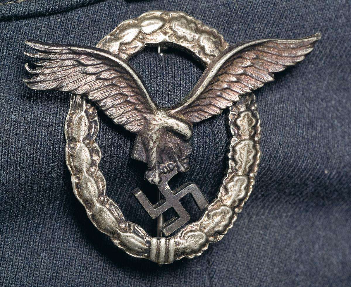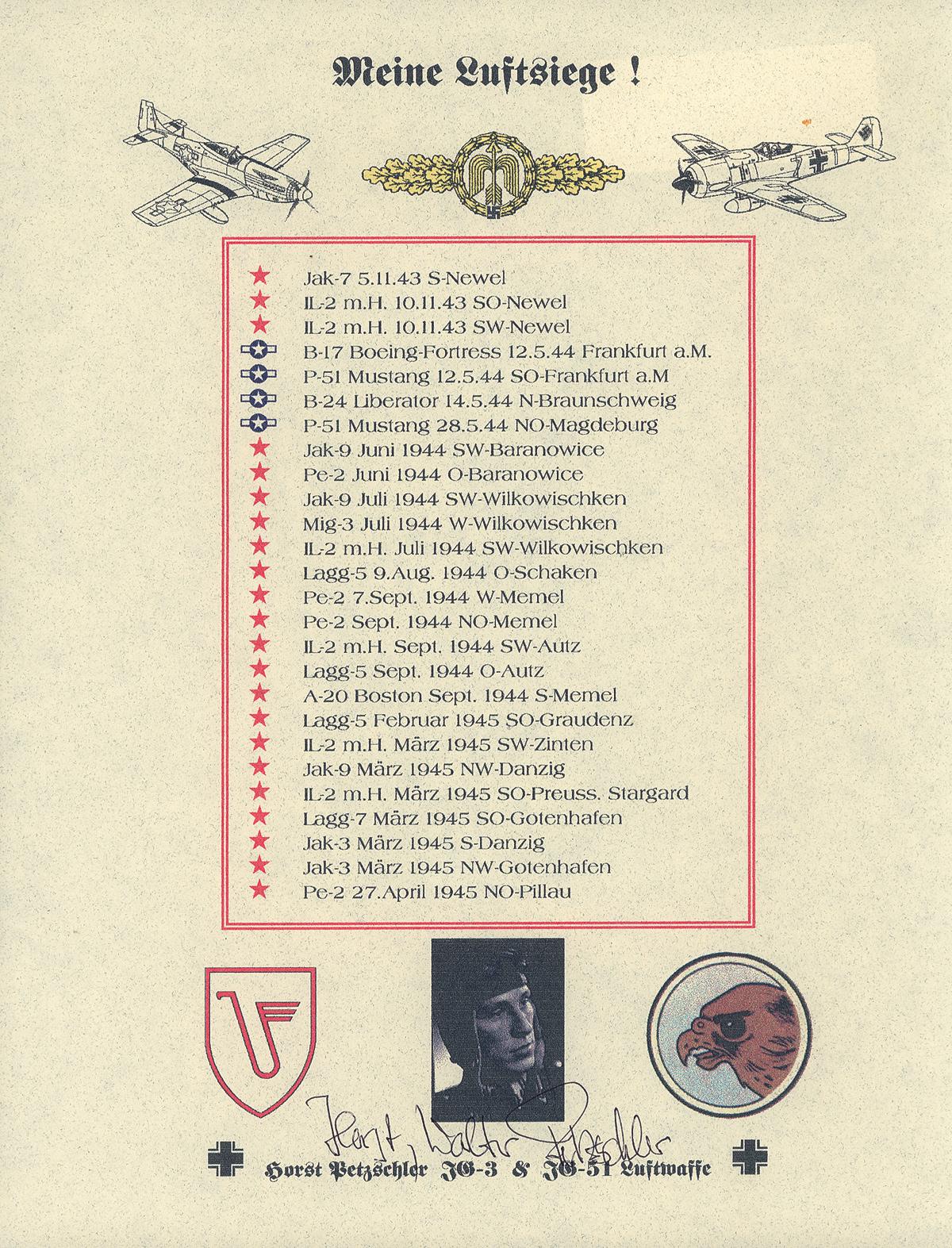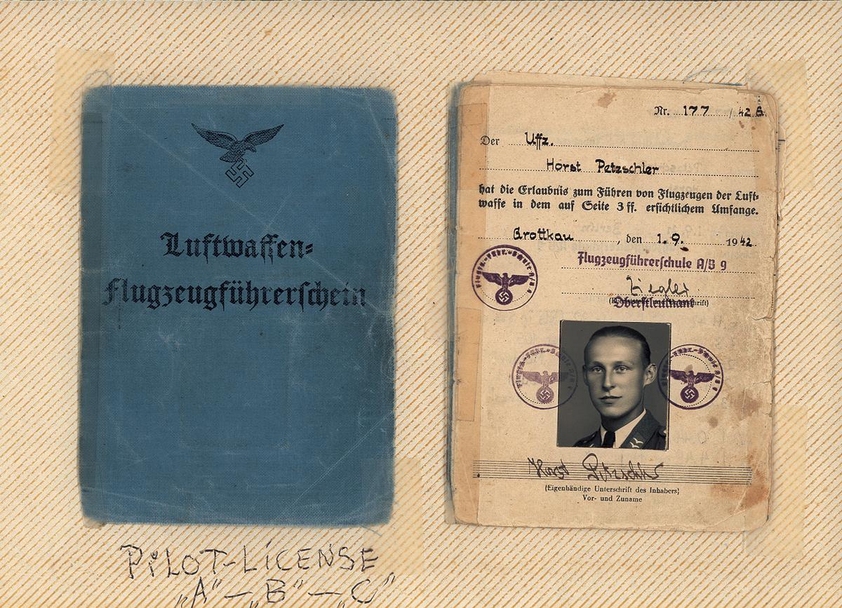 This lot consists of World War II Luftwaffe ace Horst PetzschlerÆs tunic and a collection of his personal effects. Horst Petzschler was born on 1 September 1921 in Berlin. PetzschlerÆs interest in flight began at an earlier age. As a teenager Petzschler received government sponsored youth glider training in the late 1930s and completed an apprenticeship as a toolmaker with Henschel Flugzeugwerke A.G. at Schoneld before joining the Luftwaffe at age nineteen in April 1941. After receiving NCO training, Master Sergeant Petzschler reported to Flugzeugfuhrerschule A/B-10 at Grottau in September 1941. After receiving his pilotÆs license, he entered flight schools at Oels and Olau and was assigned to a fighter school squadron located in Villacoublay, France. Still in training, Petzschler experienced combat for the first time in May 1943 when he and his other squadron mates encountered United States Army Air Force Boeing B-17 Flying Fortresses on a bombing run over Guyancourt, France. (Incidentally, one of the B-17s was the famous Memphis Belle flown by Colonel Robert Morgan.) The chance to observe American bomber formations in action allowed German fighter pilot trainees the opportunity to gain a first person account of American bomber defensive tactics. Petzschler would intercept other bomber formations before finishing most of his training in the Focke-Wulf Fw 190-A2. In late summer/early fall of 1943, Petzschler was transferred to JG 5 based at Smolensk. PetzschlerÆs primary role was tank busting, flying high and low level attacks against Russian armor in support of German troops. During his first mission, however, Petzschler was shot down for the first time by Russian flak. He was rescued by a German tank crew from the 3rd SS Panzer Division and quickly returned to flying sorties against the Russians. In all Petzschler flew 126 fighter-bomber missions and received three aerial victories before being transferred to JG 3 "Udet" near Madeburg, Germany.
