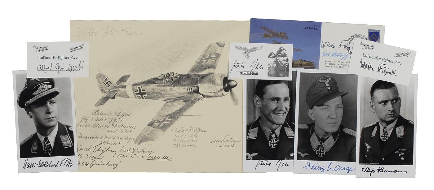 Nine items: 11 x 8.5 print of an FW-190, signed in pencil by aces Walter Schuck, Helmet Ruffler, Gerhard Thyben, and Walter Wolfrum, and also signed in pencil by the artist, Lonnie Ortega; a flight-flown RAF commemorative cover, signed by Wilhelm Batz and Erich Rudorffer; four glossy 3.5 x 6 photos, each signed in felt tip by the respective ace pictured: Heinz Lange, Gunther Rall, Hajo Herrmann, and Hans-Ekkehard Bob; and ink and felt tip signatures of Walter Krupinski, Alfred Grislawski, and Gunther Rall, on individual 3.5 x 2 collector’s cards. In fine overall condition. RRAuction COA.