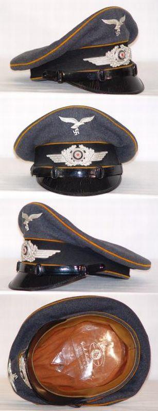 Luftwaffe EM/NCOs Fallschirmjager/Flight Visor Cap. The cap is a size 54 and is made of blue/gray wool, with a black, ribbed mohair center band and golden-yellow wool piping. The cap features a set of die stamped alloy cap insignia. The chin stra is made of black patent leather, with two black finished metal buckles. It is held in place via two black finished metal side buttons. The visor is made of black fiber with edge trim. The cap is lined with orange/brown cotton/rayon lining, andis complete with it's celluloid sweat shield, which has a crack to it. The sweat band is made of thin, beige glove leather, and is complete. The cap is free from mothing, holes or tears. the visor shows some light crazing. The overallcondition is very good+ Est. $350 - $700