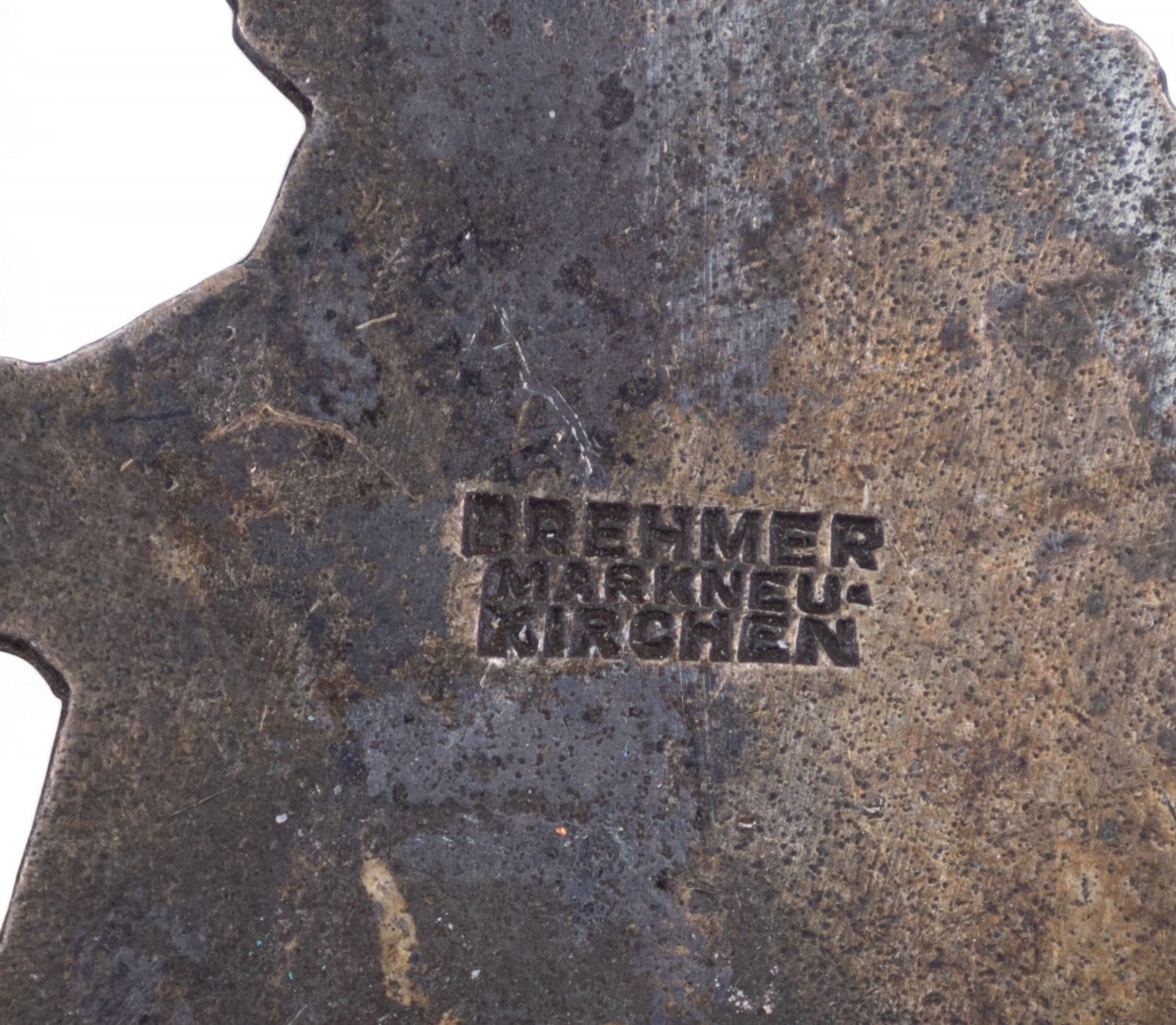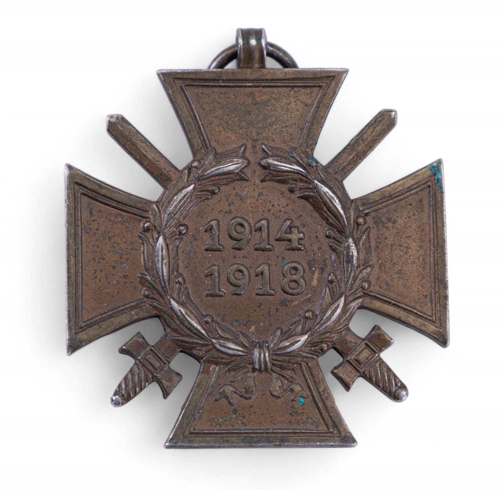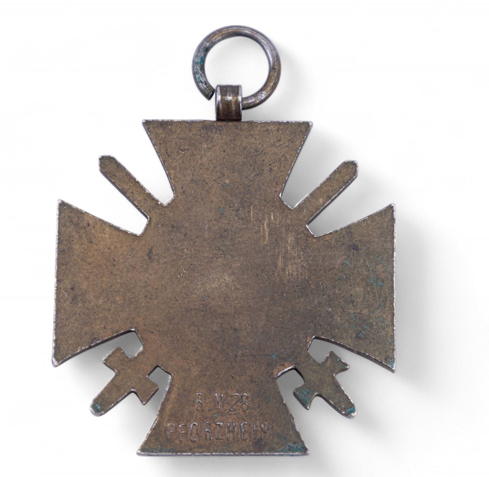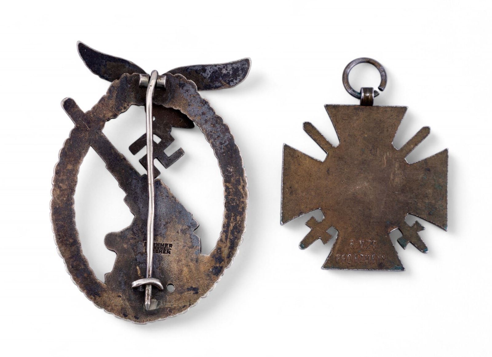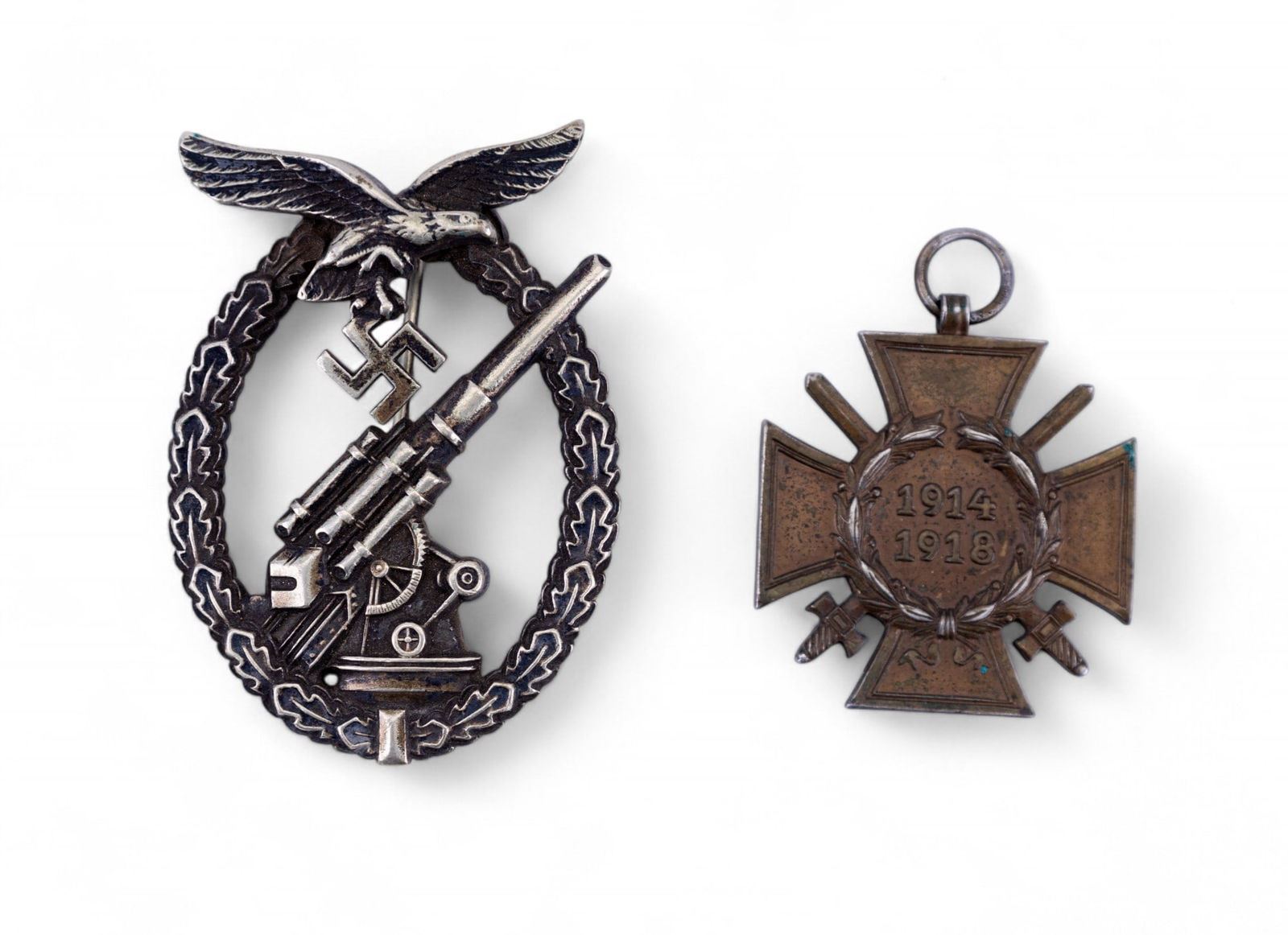 Luftwaffe Flak Badge for Flak artillery members who distinguished themselves in action against enemy aircraft. Item is engraved Brehmer Markneukirchen on back. Other item is an iron WWI 1914-1918 Combatants Cross of Honour marked Pforzheim on back. Flak Badge measures approx. 2.5" x 1.75".