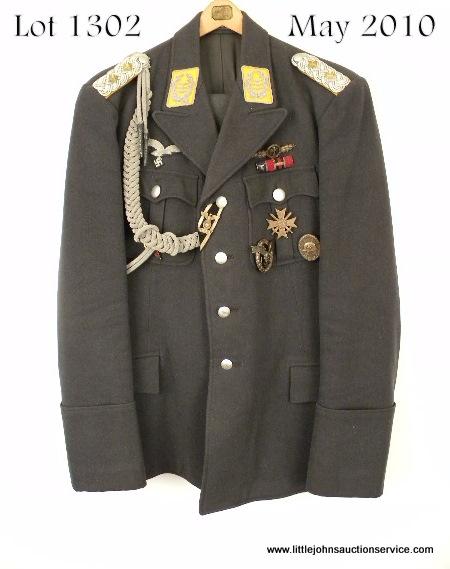 Luftwaffe Flight Colonel uniform ensemble consisting of tunic which is complete with insignia, breast badges, awards, aiguillette, dress belt, and britches. Original tailors label. Excellent condition. Est: $750 - $1,500