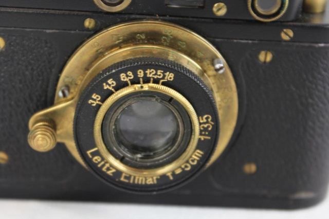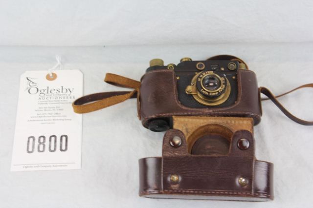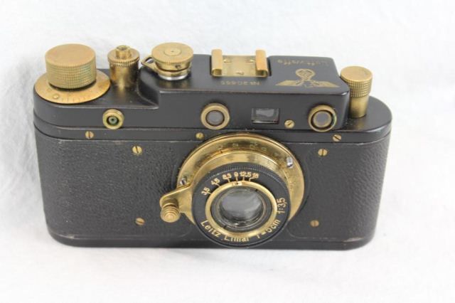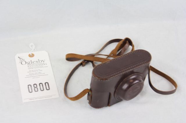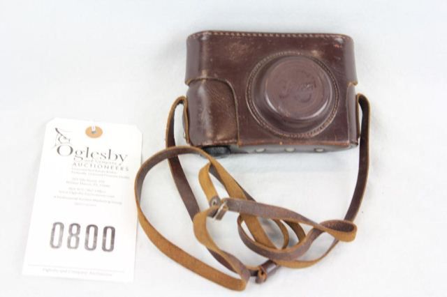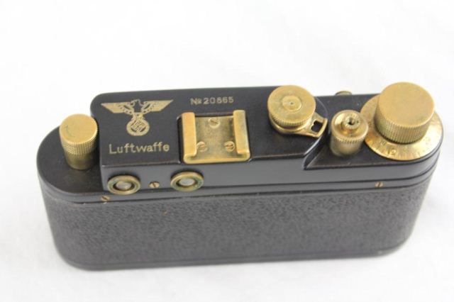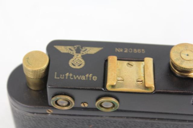 Leica camera body with Leitz Elmar Lens f=5cm 1:3,5 Top of camera body has NAZI Reichsadler emblem marked "Luftwaffe" under this. Leather case is in excellent supple condition. Camera as well is in excellent condition. A strong possibility this is either a bring back wartime trophy or recovered from a downed German pilot.